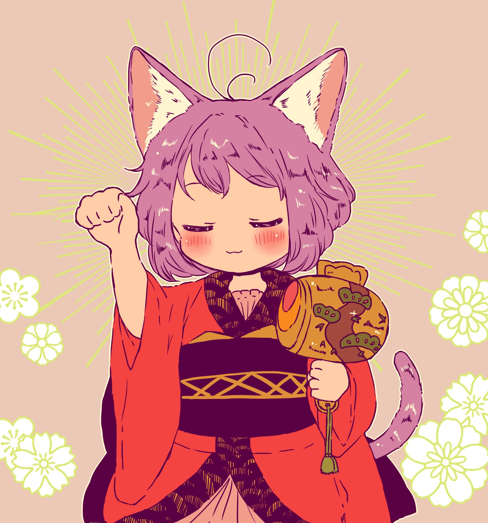 1girl ahoge animal_ears antenna_hair blush brown_background cat_ears cat_tail clenched_hand closed_eyes closed_mouth commentary_request facing_viewer highres japanese_clothes kimono maneki-neko miracle_mallet purple_hair red_kimono rin_tarou sash short_hair simple_background solo sukuna_shinmyoumaru tail touhou