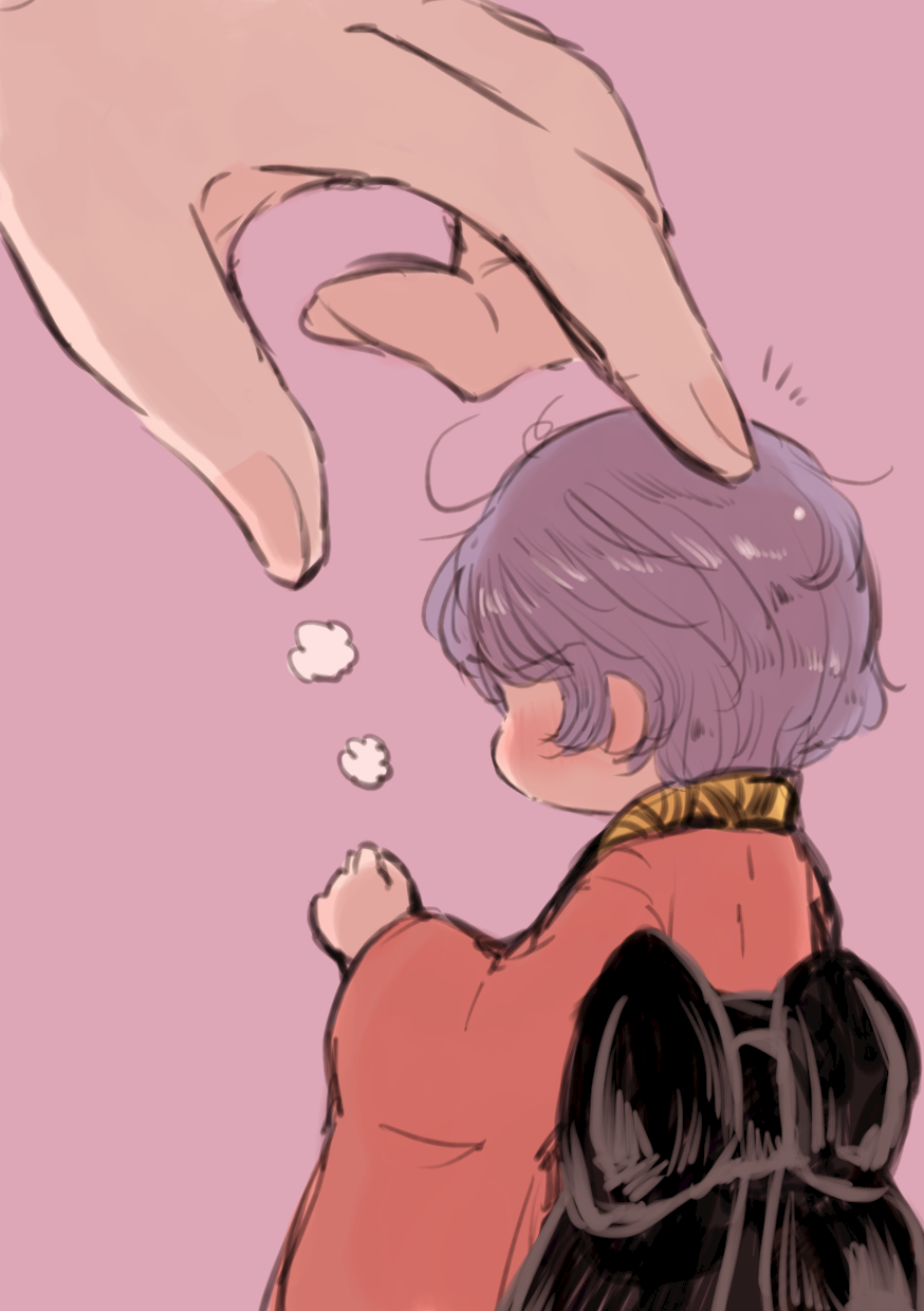 1girl 1other ahoge blush headpat highres long_sleeves mini_person minigirl purple_hair rin_tarou short_hair simple_background solo_focus sukuna_shinmyoumaru touhou upper_body wide_sleeves
