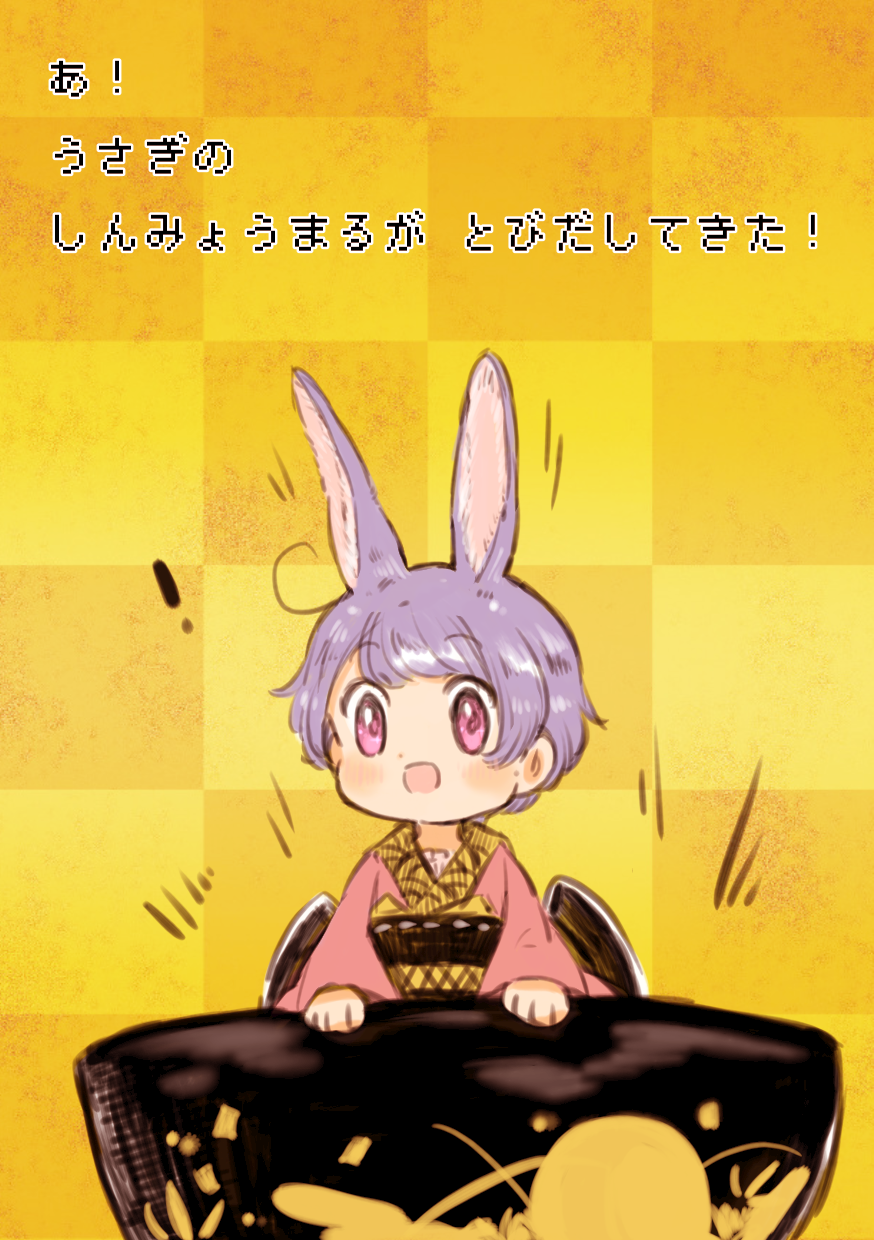 ! 1girl ahoge animal_ears black_hat bowl bowl_hat checkered_background commentary_request hat highres japanese_clothes kimono looking_at_viewer pink_eyes purple_hair rabbit_ears red_kimono rin_tarou sash short_hair solo sukuna_shinmyoumaru touhou translation_request yellow_background