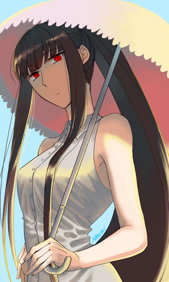 1girl breasts brown_hair commentary_request dress expressionless fate/grand_order fate_(series) long_hair medium_breasts oryou_(fate) parasol red_eyes sidelocks sleeveless sleeveless_dress solo umbrella upper_body very_long_hair white_dress yuuzuki230