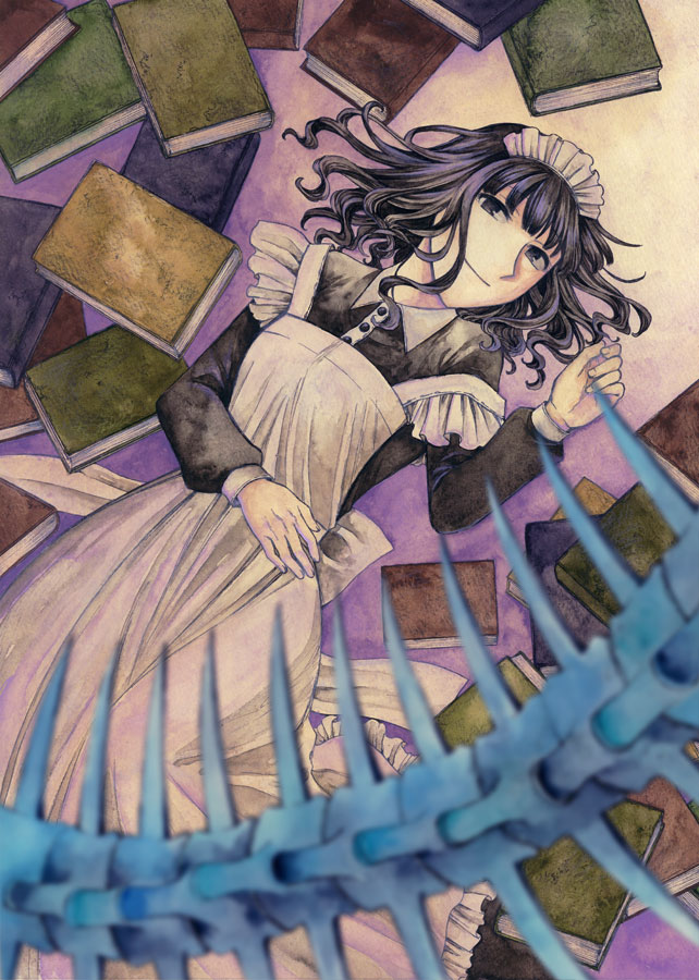 1girl apron black_eyes black_hair book breasts commentary_request kototoki_no_mahoutsukai lying maid maid_apron maid_headdress official_art on_back small_breasts smile solo spine strap_slip white_apron yuuzuki230