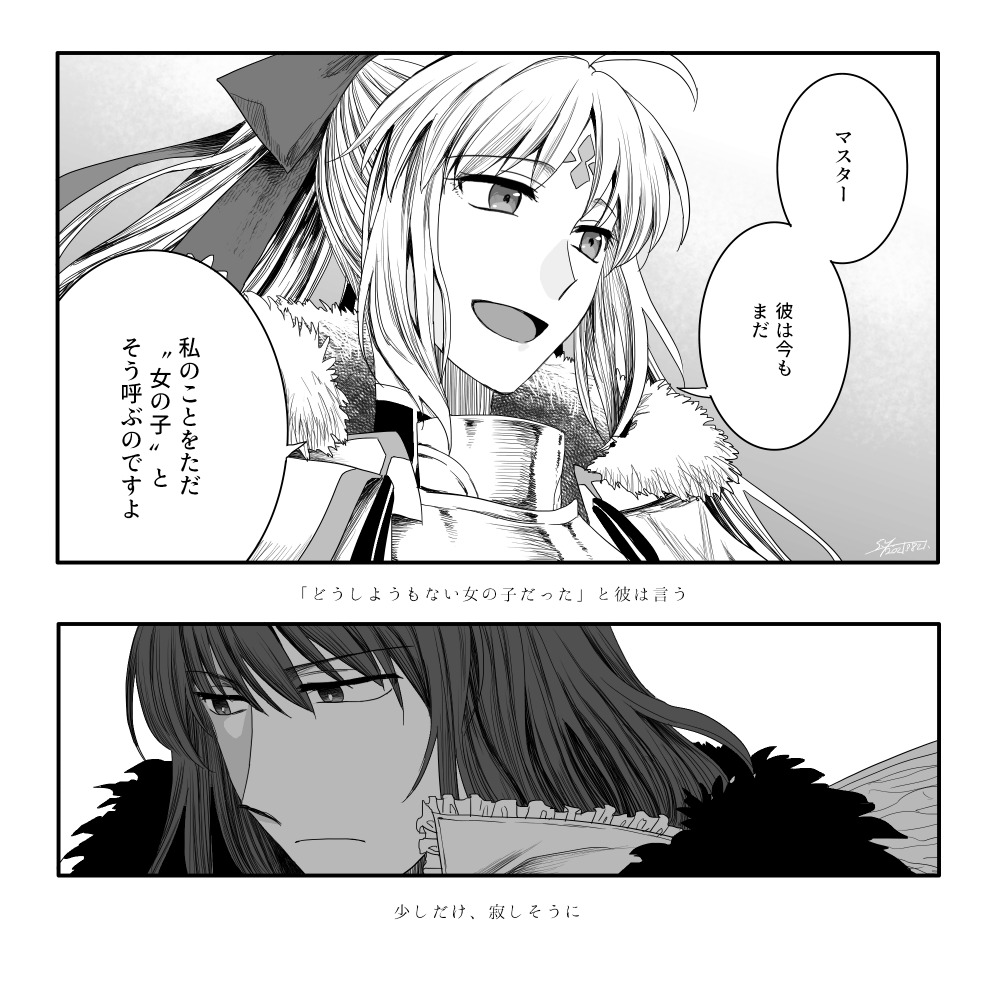 1boy 1girl armor artoria_caster_(fate) artoria_pendragon_(fate) comic facial_mark fate/grand_order fate_(series) forehead_mark frown fur_trim greyscale hair_ribbon long_hair monochrome oberon_(fate) oberon_(third_ascension)_(fate) open_mouth ponytail ribbon signature smile translation_request yuuzuki230