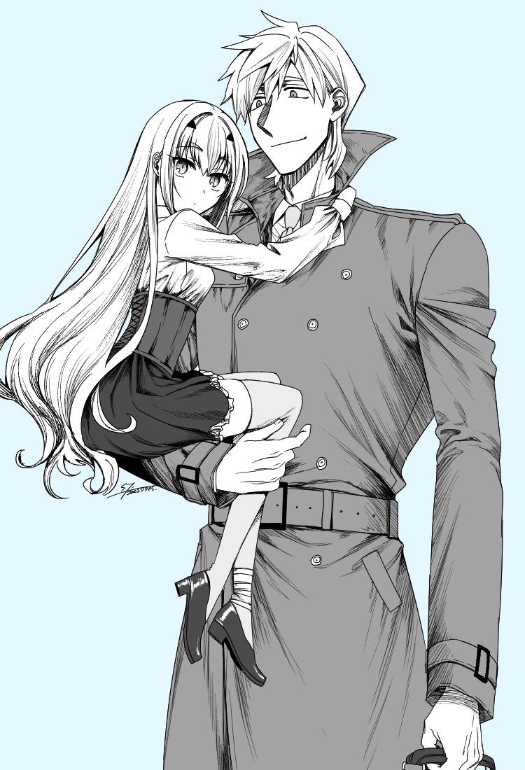 1boy 1girl breasts carrying commentary_request melusine_(fate) fate/grand_order fate_(series) greyscale holding long_coat miniskirt monochrome necktie percival_(fate) signature size_difference skirt small_breasts smile thighhighs yuuzuki230 zettai_ryouiki