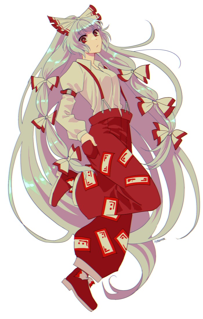 1girl absurdly_long_hair bow breasts commentary_request fujiwara_no_mokou full_body grey_hair hair_bow hand_in_pocket long_hair medium_breasts ofuda ofuda_on_clothes pants red_eyes red_pants solo suspenders touhou very_long_hair yuuzuki230