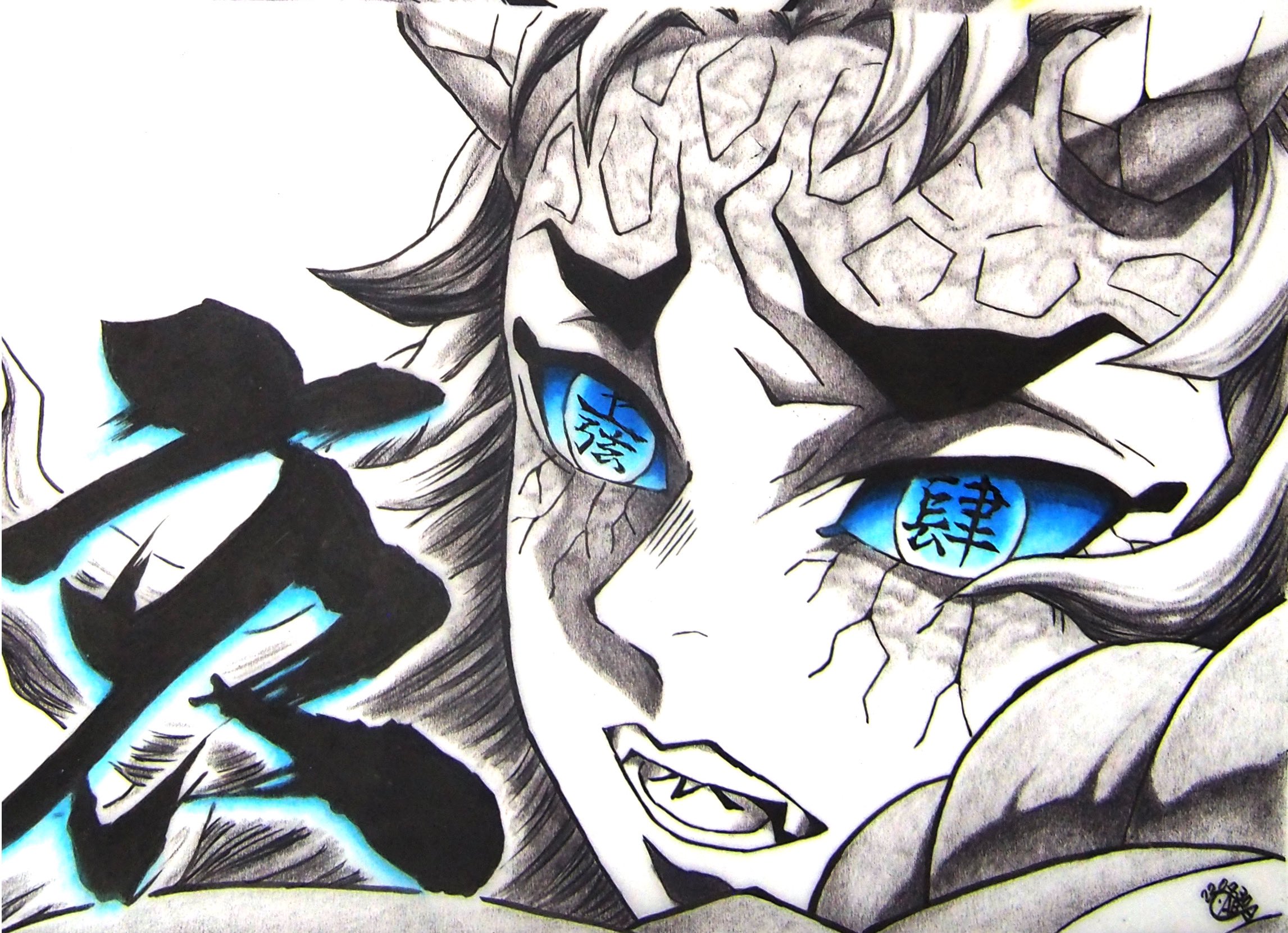 1boy blue_eyes blue_sclera blue_theme body_writing colored_sclera cracked_skin demon_boy demon_horns furrowed_brow hantengu_(kimetsu_no_yaiba) highres hitomisaba horns kimetsu_no_yaiba male_focus monochrome open_mouth photo_(medium) portrait sad simple_background solo spot_color text_in_eyes tongue traditional_media urogi_(kimetsu_no_yaiba)