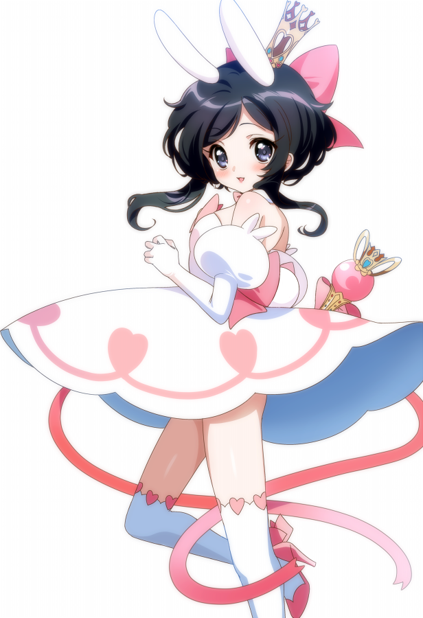 1girl animal_ears black_hair bow crown dress elbow_gloves gloves grey_eyes hair_bow long_hair long_sleeves looking_at_viewer magical_girl pink_bow pink_shoes rabbit_ears shoes short_hair_with_long_locks shulliy_baudelair simple_background smile standing standing_on_one_leg thighhighs wand white_background white_dress white_gloves white_thighhighs