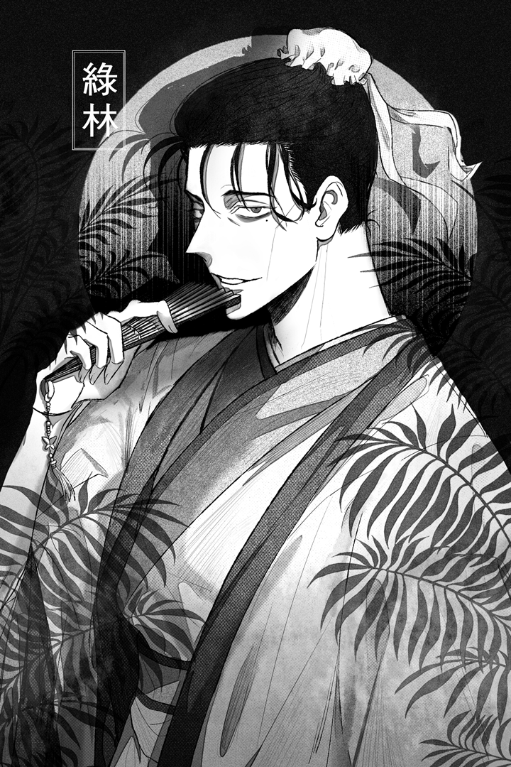 1boy black_hair folding_fan greyscale hand_fan hat japanese_clothes kimono male_focus mini_hat mole mole_under_eye monochrome nagi994 plant return_of_the_mount_hua_sect short_hair solo upper_body