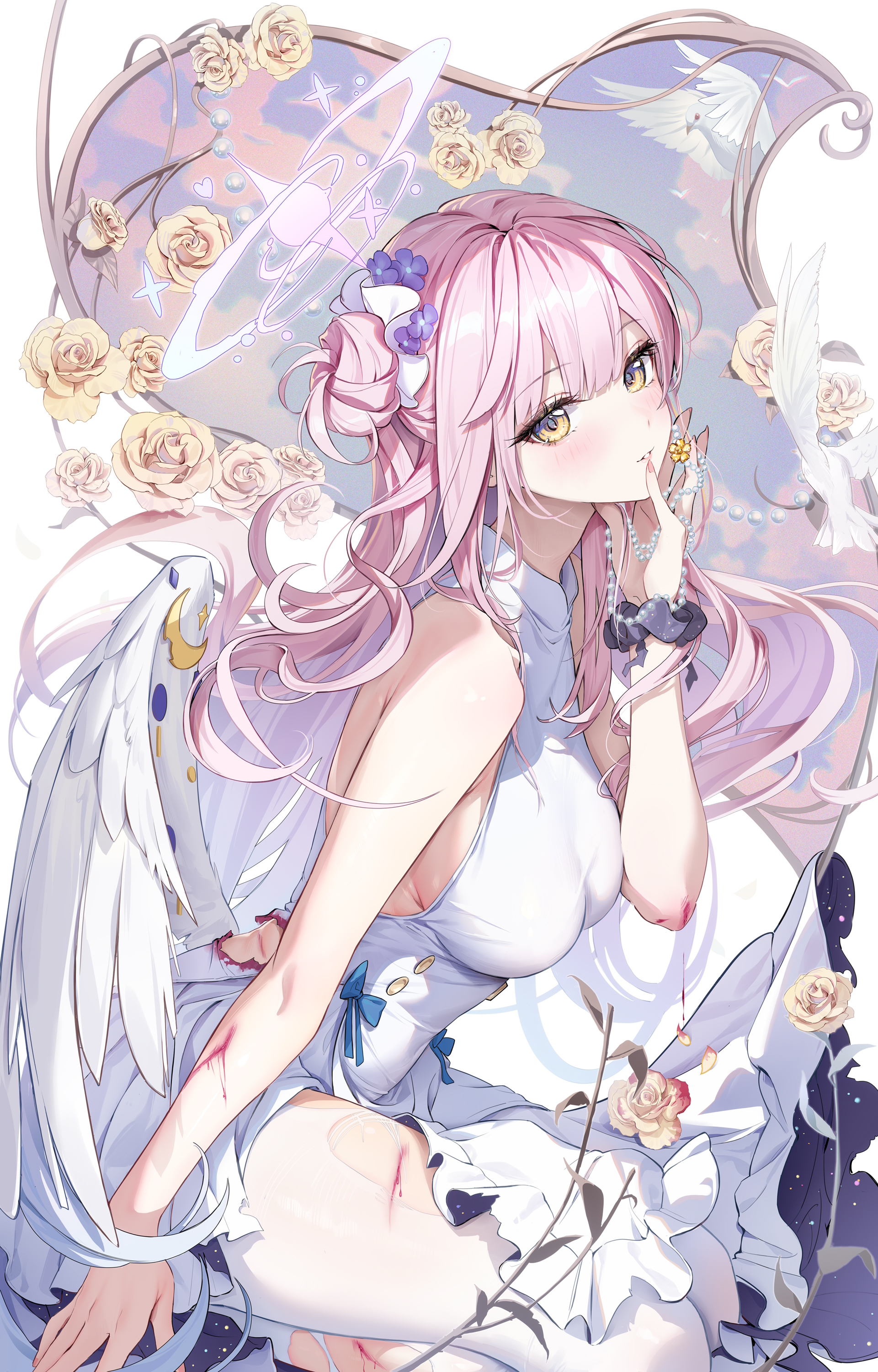 1girl absurdres bare_shoulders blue_archive blush breasts buttons double-breasted dress feathered_wings flower hair_bun hair_flower hair_ornament hair_scrunchie halo highres houkisei large_breasts long_hair looking_at_viewer low_wings mika_(blue_archive) pantyhose pink_hair rose scrunchie sidelocks single_side_bun smile solo thighs torn_clothes torn_pantyhose white_dress white_pantyhose wings wrist_scrunchie yellow_eyes