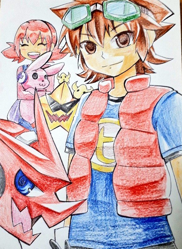 1boy 1girl cutemon digimon digimon_(creature) goggles goggles_on_head headphones hinomoto_akari looking_at_viewer pickmon pickmon_(normal) shoutmon smile starmon_(digimon_xros_wars)