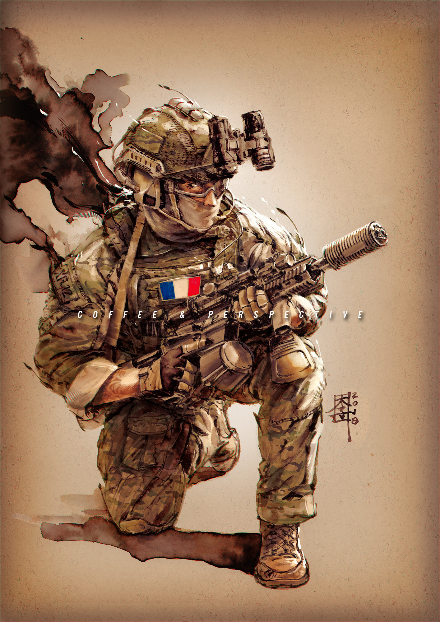 1boy arm_tattoo assault_rifle body_armor boots brown_background brown_boots brown_gloves brown_headwear brown_helmet brown_jacket brown_pants brown_theme camouflage camouflage_headwear camouflage_helmet camouflage_jacket camouflage_pants chinstrap combat_boots combat_helmet commentary desert_camouflage drum_magazine english_commentary facebook_username fast_helmet foregrip france french_flag full_body gloves gradient_background gun h&k_hk416 headset helmet highres holding holding_gun holding_weapon jacket knee_pads lace-up_boots light_brown_background load_bearing_vest looking_ahead magazine_(weapon) mar-c! mask military_combat_uniform military_fatigues military_jacket military_operator military_uniform mixed_media night_vision_device on_one_knee original pants paper_texture patch pen_(medium) pocket realistic rifle safety_glasses scope signature sleeves_rolled_up spot_color suppressor tattoo three-quarter_sleeves traditional_media trigger_discipline two-tone_gloves vertical_foregrip watermark weapon