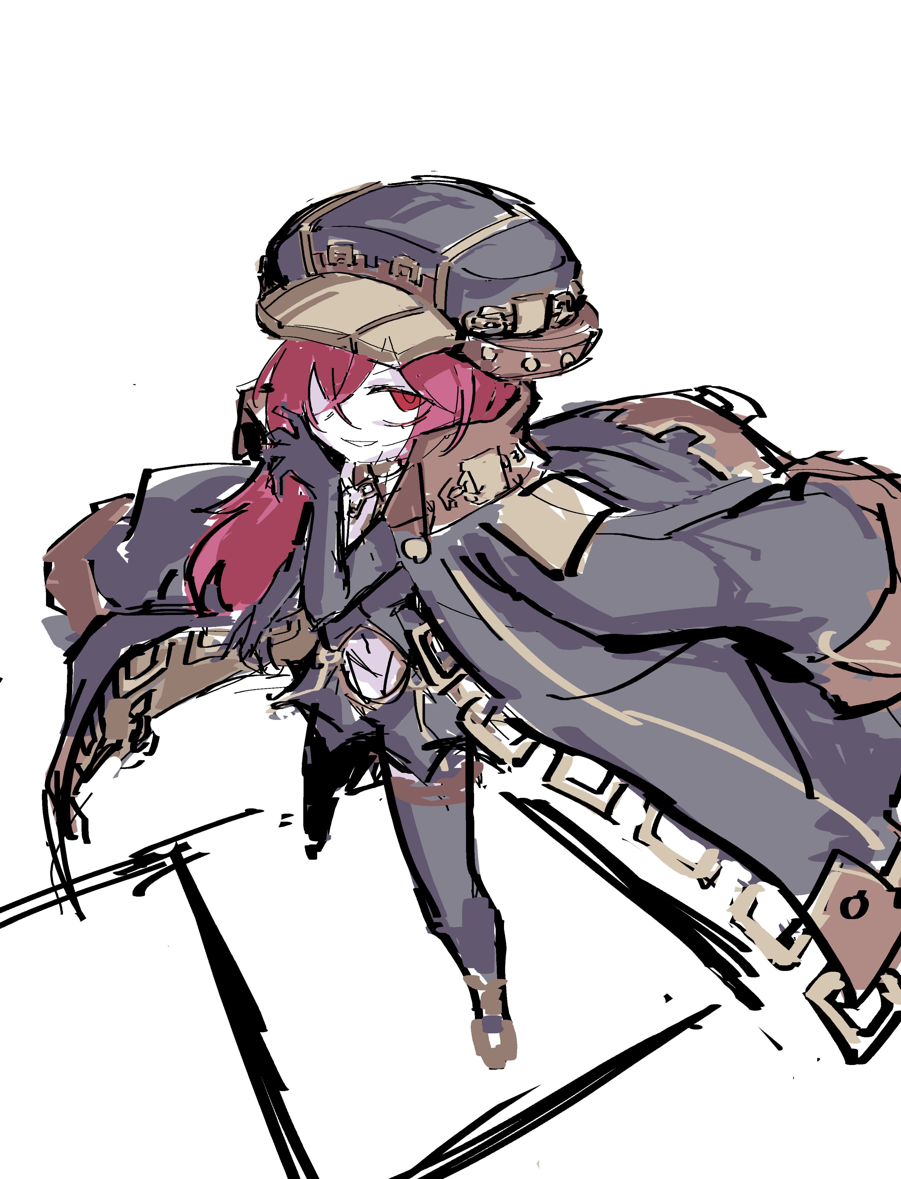 1girl absurdres alasharx black_coat black_dress black_gloves black_hat black_thighhighs chinese_commentary clothing_cutout coat coat_on_shoulders colored_skin commentary_request crossed_bangs dita_(sequel) dress elbow_gloves eyes_visible_through_hair gloves grey_skin hat highres key long_hair navel navel_cutout open_clothes open_coat pink_hair red_eyes red_pupils sequel_(series) sequel_kludge short_dress simple_background smile solo standing thighhighs white_background