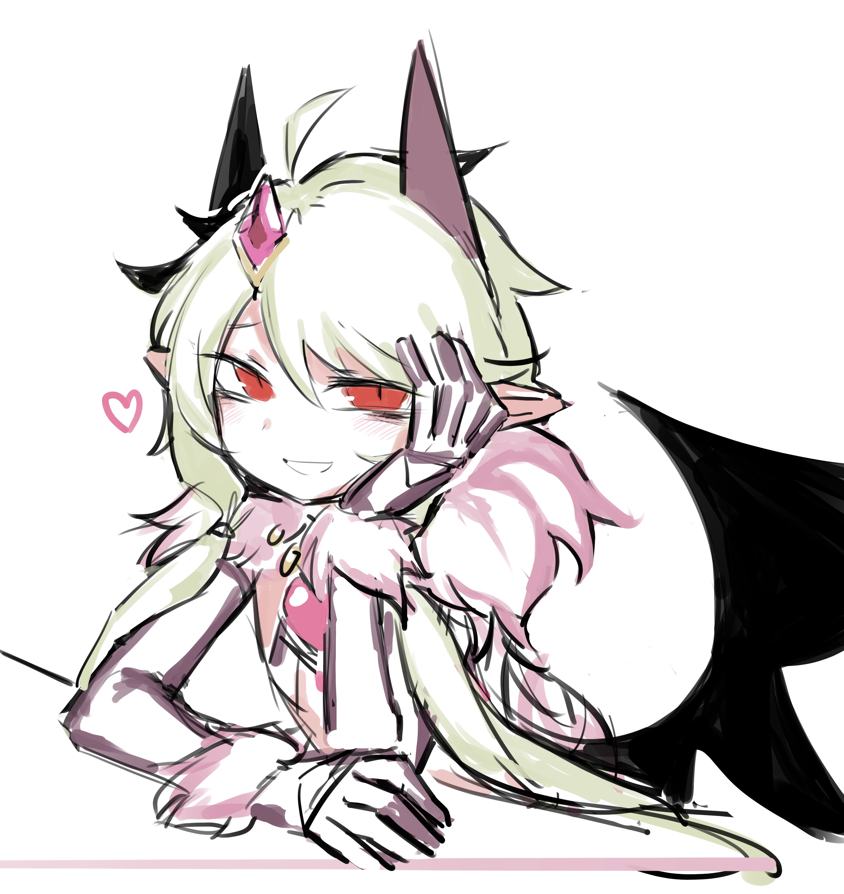 1boy absurdres ahoge alasharx black_wings blush chinese_commentary clarute_(sequel_awake) commentary_request demon_boy demon_horns elbow_gloves fur_collar gloves hand_on_own_face head_rest heart highres horns light_green_hair looking_at_viewer low_twintails pointy_ears purple_gloves purple_horns red_eyes sequel_(series) sequel_awake simple_background smile solo trap twintails white_background wings