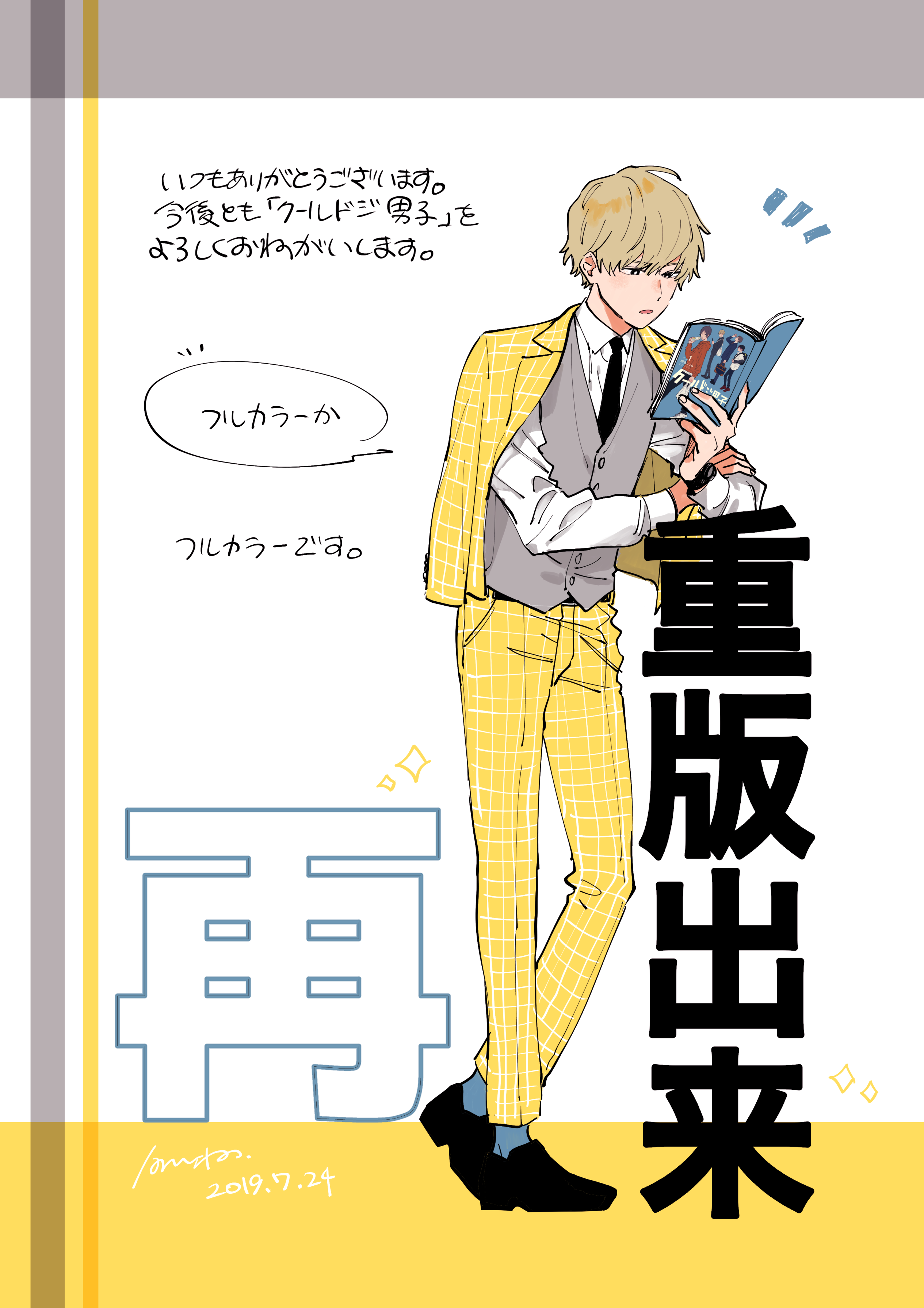 1boy absurdres black_footwear black_necktie blue_socks bright_pupils buttons collared_shirt colored_eyelashes commentary_request cool_doji_danshi dated full_body futami_shun grey_vest hand_on_own_arm highres holding holding_manga ichikura_hayate jacket jacket_on_shoulders lapels long_sleeves manga_(object) mima_takayuki nata_kokone necktie open_mouth pants plaid_clothes plaid_jacket plaid_pants shiki_souma shirt short_sleeves signature socks standing translation_request vest watch white_pupils white_shirt wristwatch