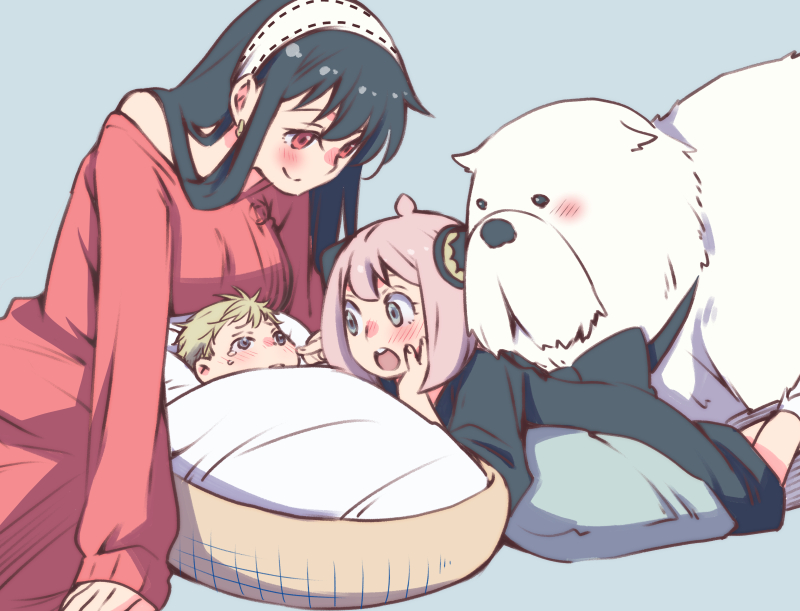 1boy 2girls adoptive_parent_and_adoptive_child anya_(spy_x_family) bare_shoulders black_hair blush bond_(spy_x_family) breasts child earrings family gold_earrings great_pyrenees hair_ornament hairband hairpods if_they_mated jewelry kamimiya large_breasts long_hair mother_and_child mother_and_daughter mother_and_son multiple_girls open_mouth original parent_and_child pink_hair red_eyes red_sweater smile spy_x_family sweater two-sided_fabric white_hairband yor_briar