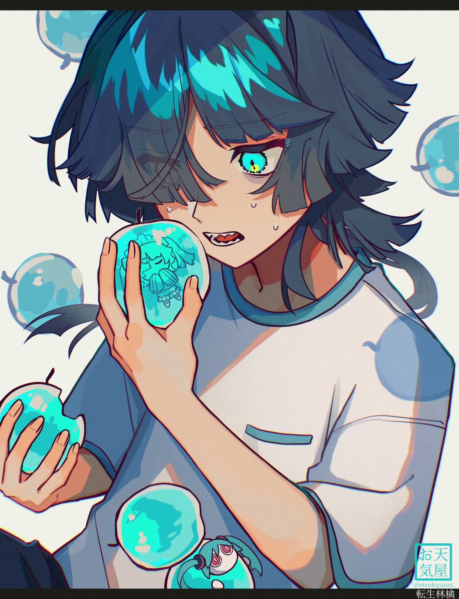 1girl aimaina amenochi_hare apple artist_name bags_under_eyes black_hair blue_eyes blush breast_pocket breasts eyes_visible_through_hair food food-themed_background fruit hair_over_one_eye highres holding holding_food holding_fruit letterboxed long_bangs looking_at_food medium_hair open_mouth pocket sharp_teeth shirt short_sleeves sidelocks small_breasts solo sweat t-shirt teeth tensei_ringo_(vocaloid) upper_body vocaloid watermark white_background white_shirt