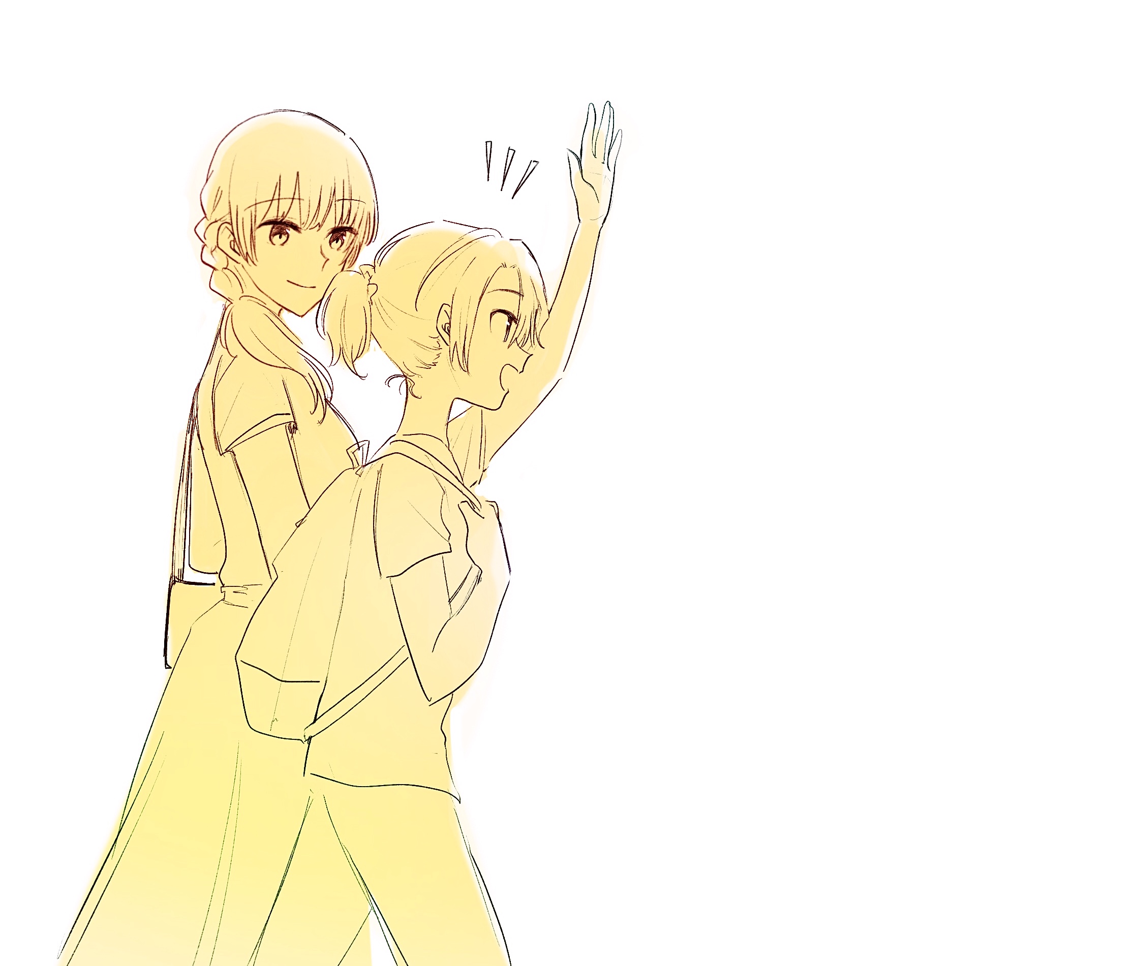 2girls backpack bag braid closed_mouth commentary_request cowboy_shot edamoto_haru highres long_hair looking_at_another multiple_girls nyamo open_mouth outstretched_hand partial_commentary ponytail saeki_sayaka short_sleeves shoulder_bag simple_background waving white_background yagate_kimi_ni_naru yagate_kimi_ni_naru:_saeki_sayaka_ni_tsuite