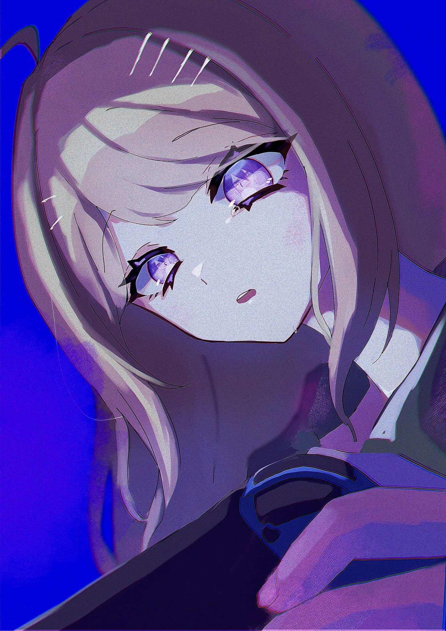 1girl ahoge akamatsu_kaede blonde_hair blue_background blue_eyes danganronpa_(series) danganronpa_v3:_killing_harmony donburi_(minami_don) hair_ornament hairclip handheld_game_console highres holding holding_handheld_game_console long_hair looking_down nintendo_switch solo tearing_up upper_body