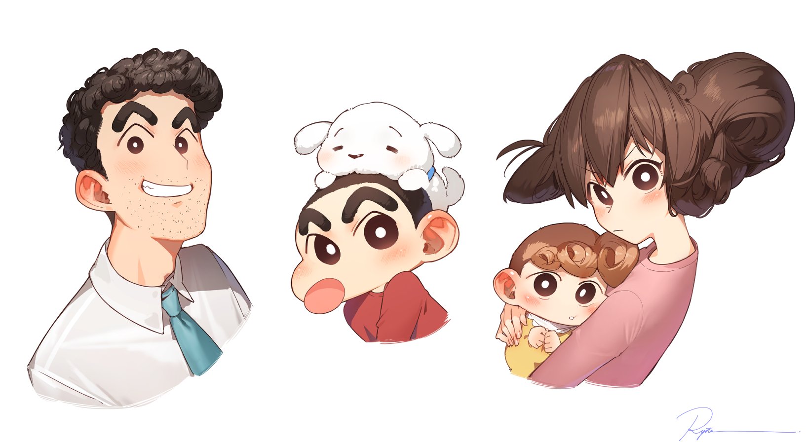 2boys 2girls animal animal_on_head baby baby_carry black_hair blush bright_pupils brown_hair carrying child crayon_shin-chan cropped_torso dog facial_hair family grin highres looking_at_viewer multiple_boys multiple_girls nohara_himawari nohara_hiroshi nohara_misae nohara_shinnosuke on_head ryota_(ry_o_ta) shiro_(crayon_shin-chan) signature simple_background smile thick_eyebrows upper_body white_background white_dog