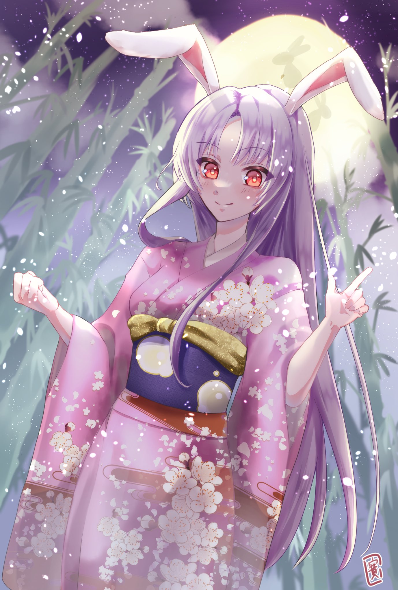 1girl alternate_costume animal_ears bamboo bamboo_forest closed_mouth commentary_request ellen_drawing floral_print forest full_moon highres japanese_clothes kimono long_hair long_sleeves looking_at_viewer moon nature outdoors parted_bangs pink_kimono purple_hair rabbit_ears rabbit_girl red_eyes reisen_udongein_inaba sash signature solo touhou wide_sleeves