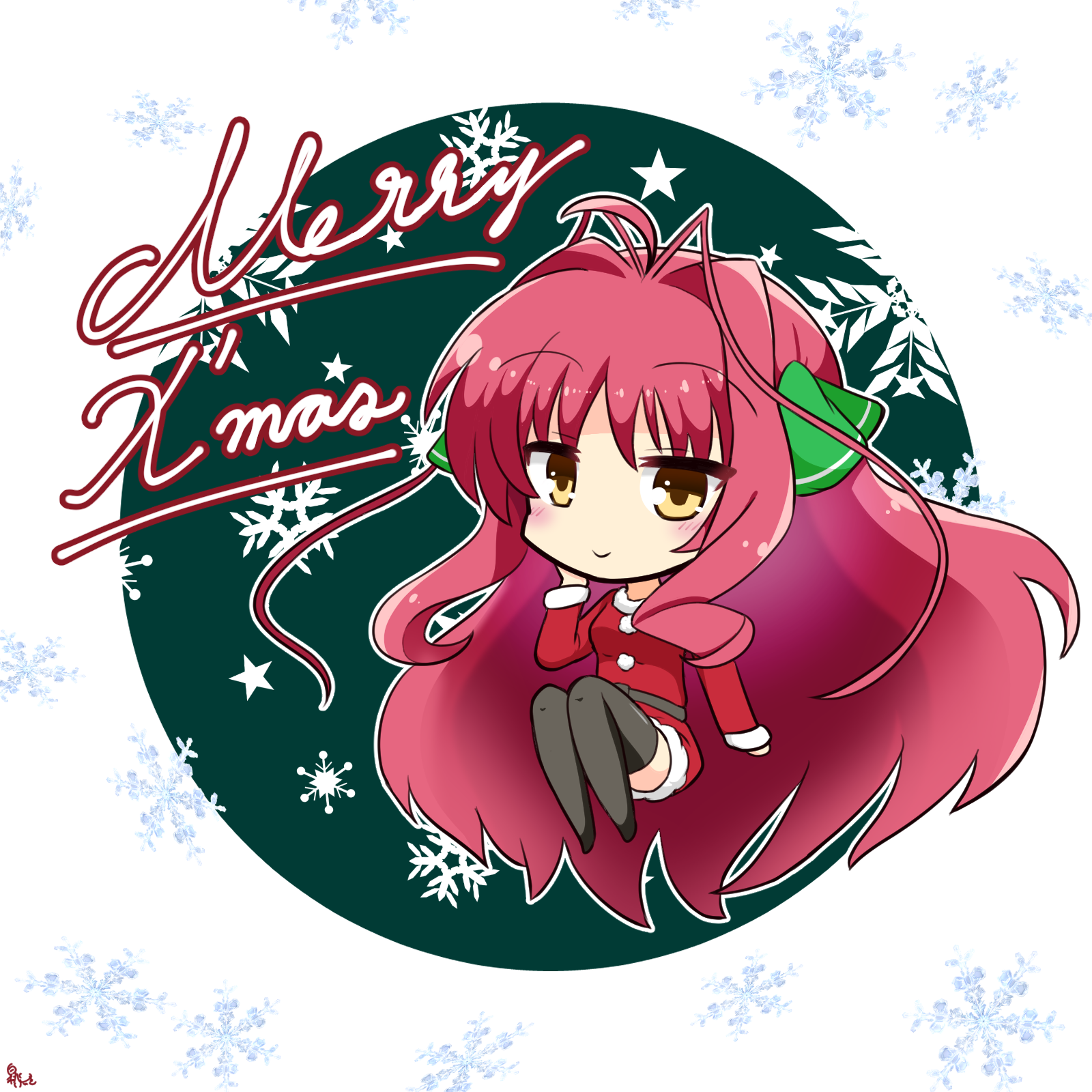 1girl antenna_hair black_thighhighs breasts chibi christmas cleavage commentary_request dracu-riot! dress eyes_visible_through_hair fur-trimmed_dress fur-trimmed_sleeves fur_trim green_background green_ribbon hair_intakes hair_ribbon hakutocake hand_up highres knees_up light_blush long_hair long_sleeves medium_breasts merry_christmas parted_bangs red_hair ribbon santa_costume santa_dress sidelocks simple_background smile snowflake_background snowflakes solo thighhighs very_long_hair wavy_hair white_background yarai_miu yellow_eyes zettai_ryouiki