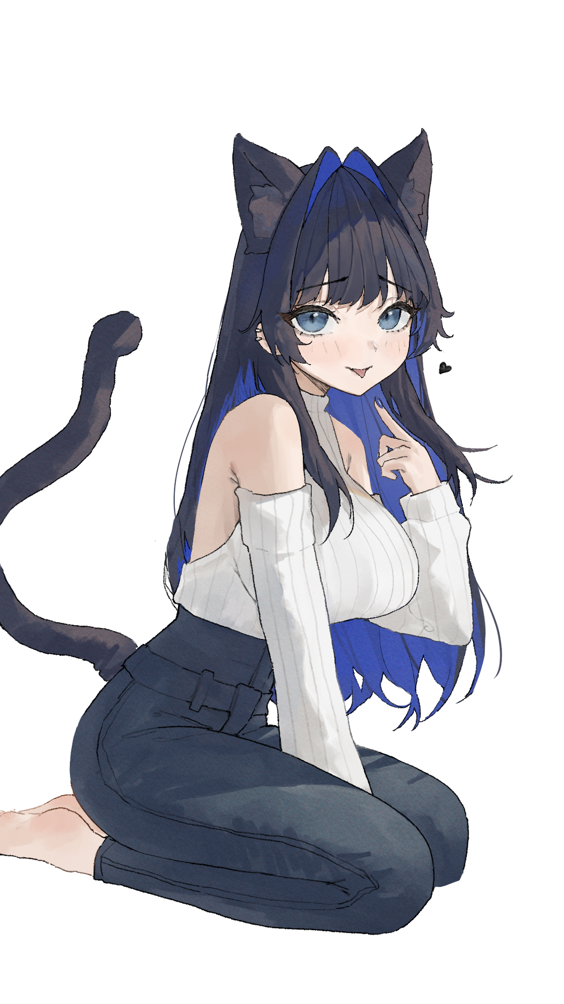 1girl animal_ears arch_05x bare_shoulders barefoot black_heart_(neptunia) blue_eyes blue_hair blue_nails blue_pants blunt_bangs blush breasts cat_ears cat_tail colored_inner_hair commentary denim detached_sleeves ear_piercing english_commentary extra_ears feet fingernails hair_intakes heart high-waist_pants highres hololive hololive_english jeans jewelry large_breasts long_hair long_sleeves looking_at_viewer multicolored_hair nail_polish official_alternate_costume ouro_kronii ouro_kronii_(casual) pants piercing seiza shirt simple_background sitting soles solo tail tongue very_long_hair virtual_youtuber white_background white_shirt