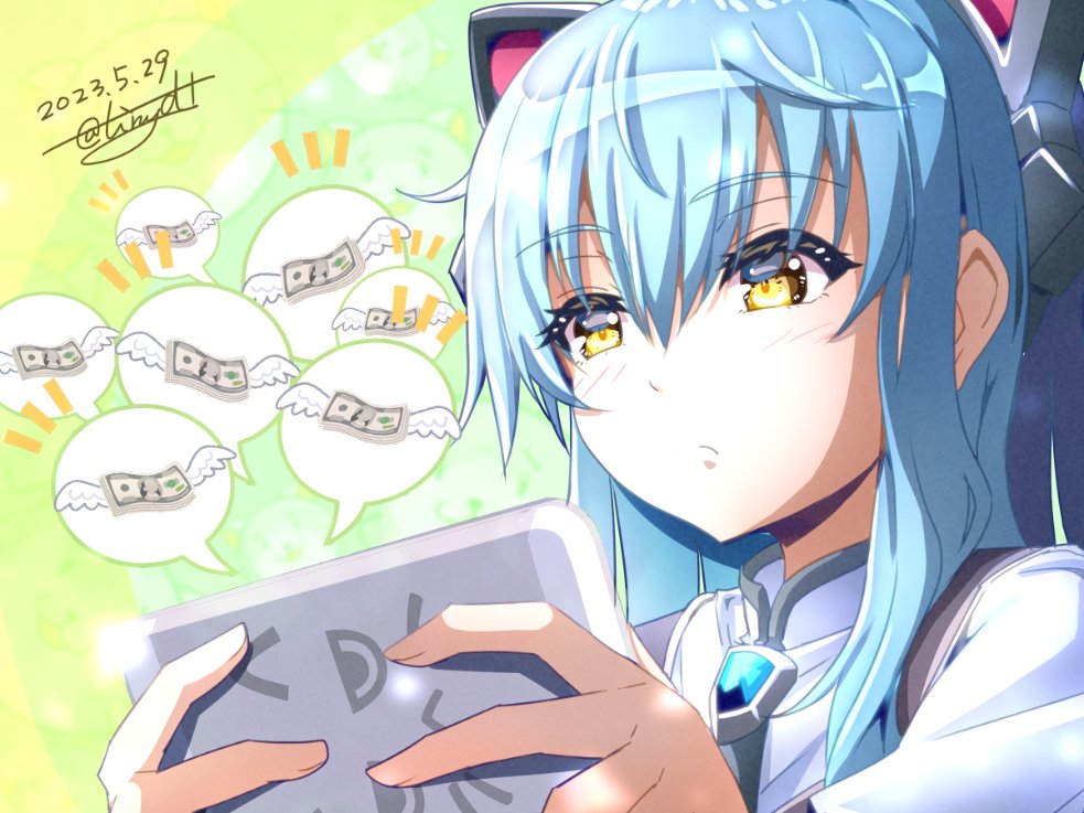 1girl animal_ear_hairband animal_ears ao_no_kiseki banknote blue_hair bob_cut brooch cat_ear_hairband cat_ears cellphone dated dollar_bill eiyuu_densetsu fake_animal_ears hair_between_eyes hairband holding holding_phone jewelry money phone sidelocks signature smartphone tinybiard tio_plato twitter_username yellow_eyes zero_no_kiseki
