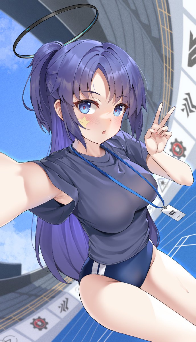 1girl armpit_peek black_shirt blue_archive blue_buruma blue_eyes breasts buruma gym_shirt gym_uniform halo highres id_card lanyard long_hair looking_at_viewer matrix16 medium_breasts official_alternate_costume ponytail purple_hair reaching reaching_towards_viewer red_pupils selfie shirt solo stadium star_(symbol) star_sticker sticker sticker_on_face thighs v yuuka_(blue_archive) yuuka_(track)_(blue_archive)
