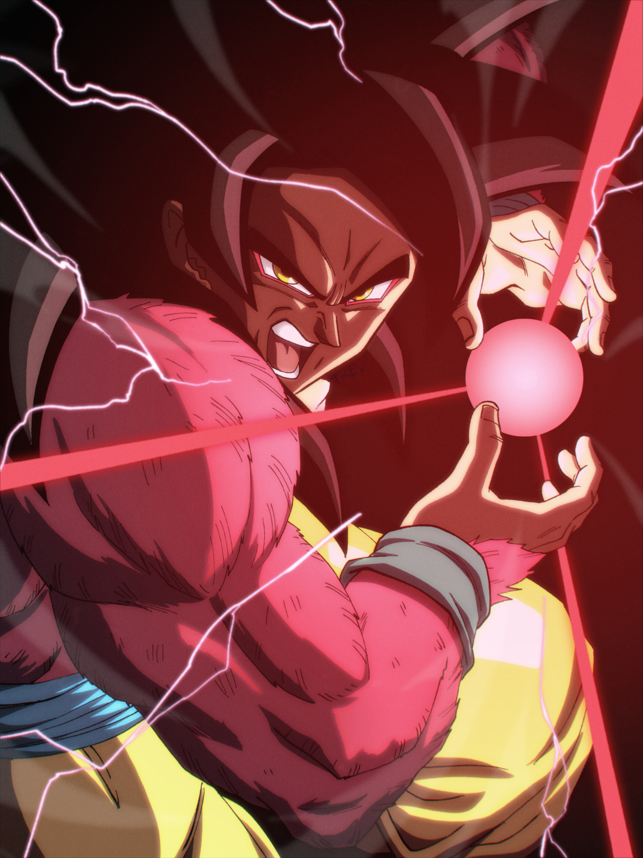 1girl absurdres black_hair powering_up dragon_ball dragon_ball_gt energy eyeshadow highres iamthetrev kamehameha_(dragon_ball) kamehameha_10x lightning looking_at_viewer makeup muscular muscular_male open_mouth pants powering_up red_fur serious son_goku spiked_hair super_saiyan super_saiyan_4 teeth yellow_eyes yellow_pants