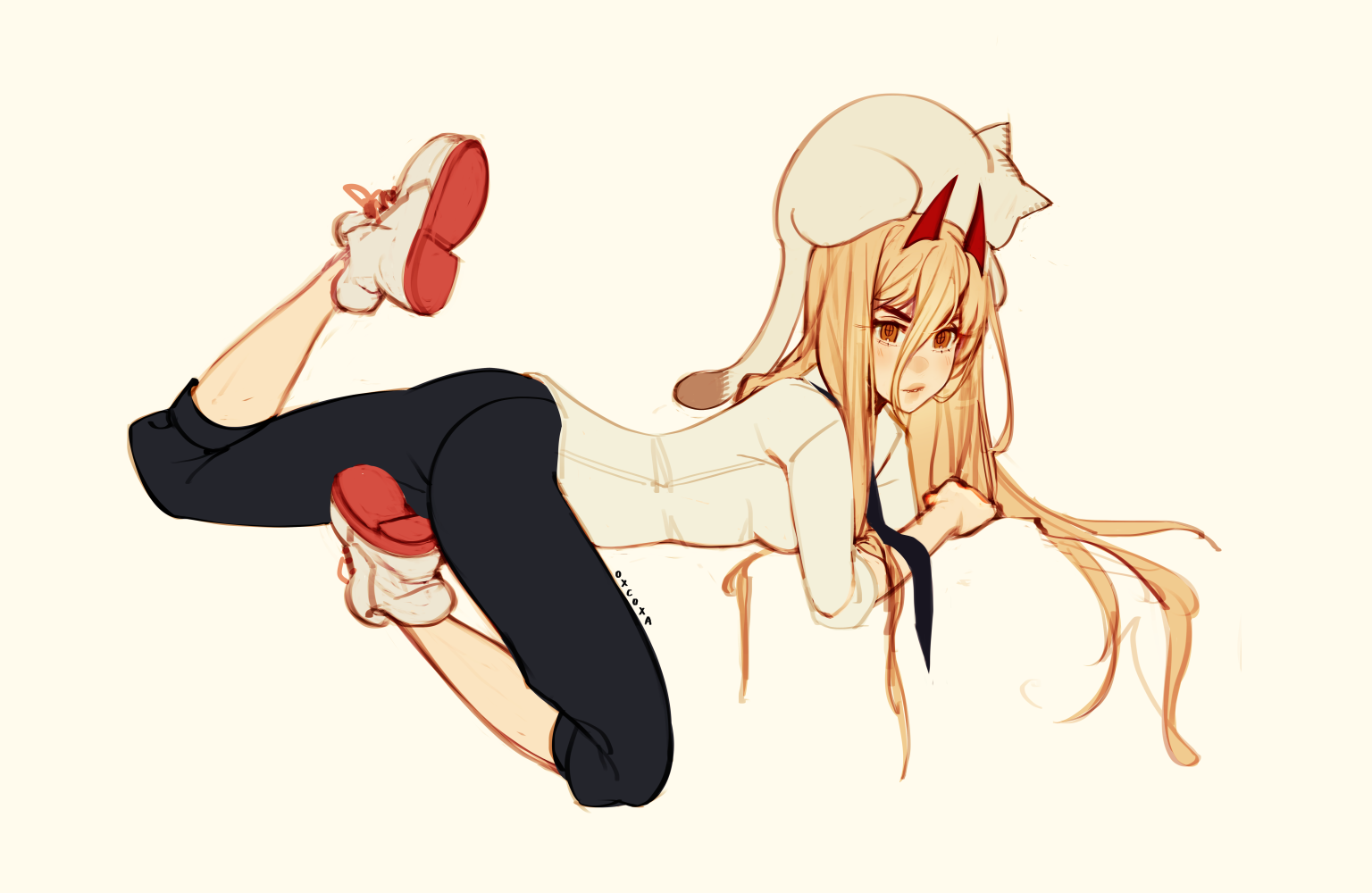 1girl animal animal_on_head artist_name black_necktie black_pants blonde_hair brown_eyes cat cat_on_head chainsaw_man collared_shirt cross-shaped_pupils hair_between_eyes hair_flowing_over horns invisible_floor long_hair looking_at_viewer lying meowy_(chainsaw_man) necktie on_head on_stomach oxcoxa pants pants_rolled_up power_(chainsaw_man) red_horns shirt shirt_tucked_in simple_background symbol-shaped_pupils white_background white_shirt