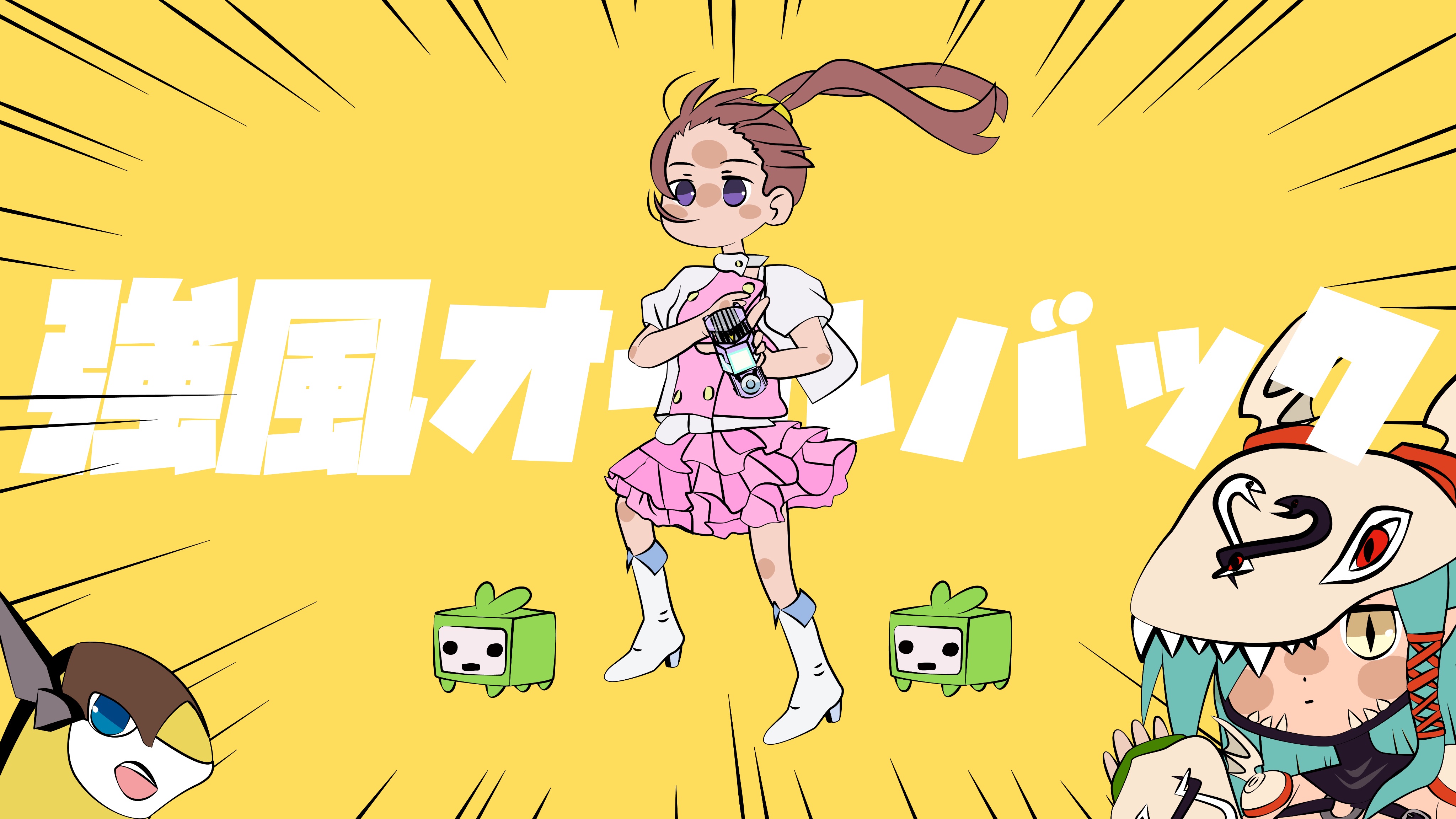 absurdres amano_nene_(digimon_xros_wars) brown_hair digimon digimon_(creature) digimon_xros_wars hair_ornament hairclip highres kyoufuu_all_back_(vocaloid) long_hair mervamon monimon multiple_girls purple_eyes running sparrowmon twintails vocaloid