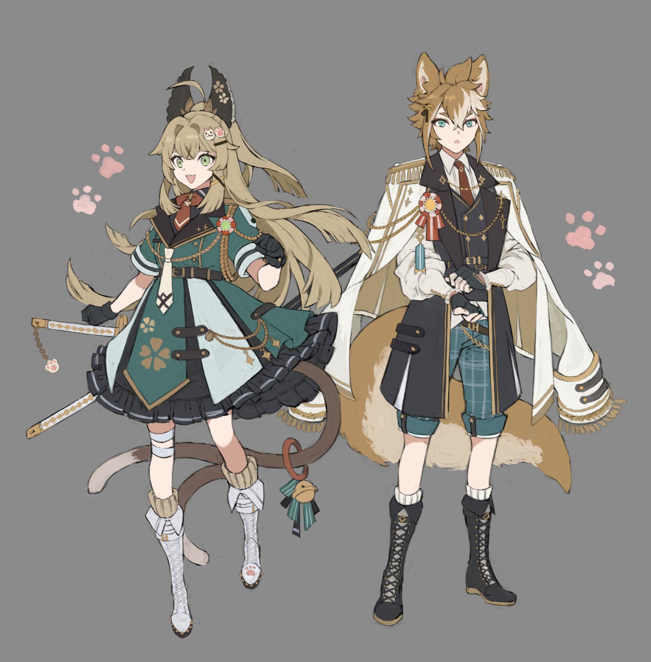 1boy 1girl ahoge animal_ears aqua_eyes badge belt black_belt black_footwear black_gloves boots bow brown_bow brown_hair cat_ears cat_girl cat_tail chain coat coat_on_shoulders dog_boy dog_ears dog_tail dress fingerless_gloves frilled_dress frills genshin_impact gloves gorou_(genshin_impact) green_dress grey_background hair_bow hair_intakes highres kirara_(genshin_impact) lolita_fashion looking_at_viewer military_lolita multicolored_hair necktie nekomata papajay_(jennygin2) paw_pose paw_print red_necktie sidelocks simple_background streaked_hair tail tail_ornament tail_ring white_coat white_footwear white_necktie