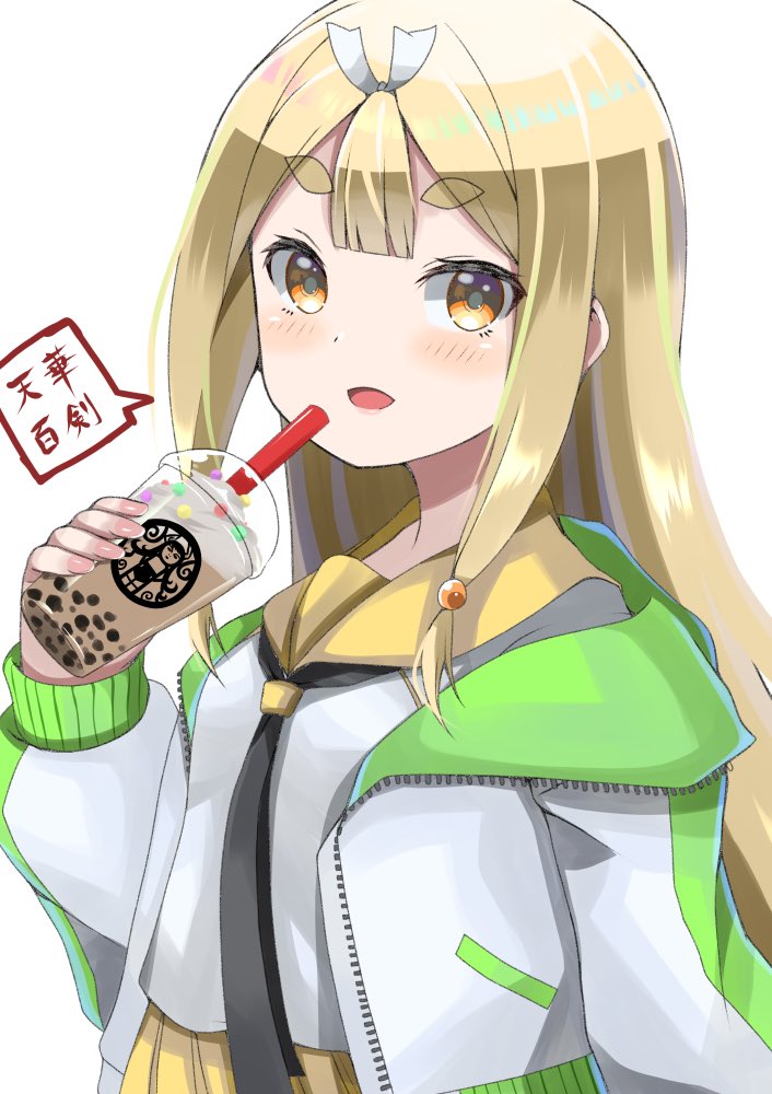 1girl akiyasu black_neckerchief blonde_hair blush bubble_tea copyright_name cup disposable_cup drinking_straw green_jacket holding holding_cup jacket long_hair long_sleeves low-tied_sidelocks neckerchief official_alternate_costume oodenta_mitsuyo_(tenka_hyakken) open_mouth sailor_collar school_uniform shirt short_eyebrows sidelocks skirt solo tenka_hyakken upper_body white_shirt yellow_eyes yellow_sailor_collar yellow_skirt