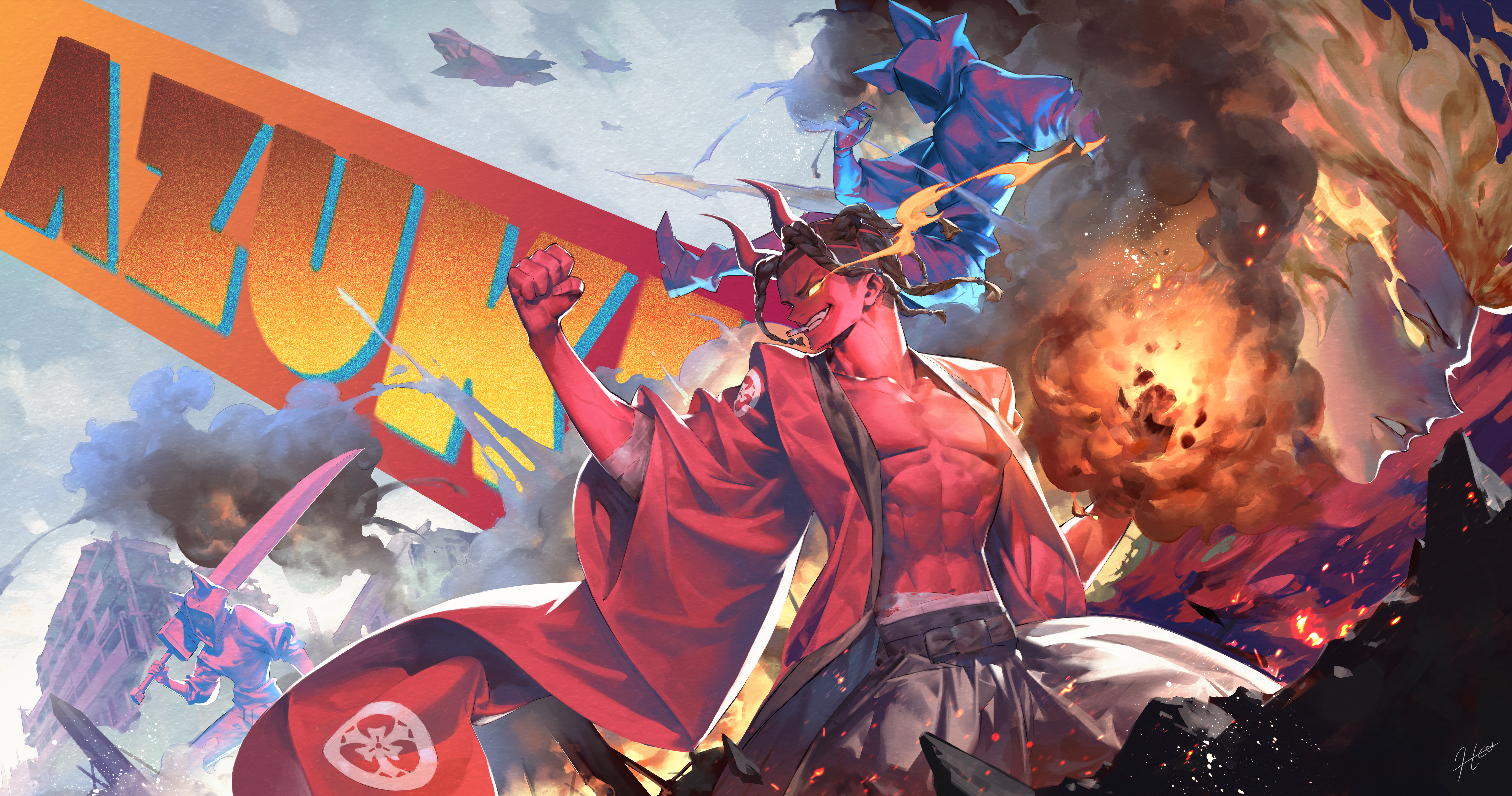 1girl 3boys abs absurdres aircraft airplane animal_ears bandaged_arm bandages black_hair black_pants boots braid clenched_hand clenched_teeth colored_skin commentary english_commentary eye_trail fake_animal_ears fighter_jet glowing glowing_eyes hand_up highres holding holding_sword holding_weapon hood hood_up horns jung_wonjo light_trail looking_afar medium_hair military military_vehicle mouth_hold multiple_boys muscular muscular_male navel open_clothes open_robe original outdoors pants red_robe red_skin robe rubble signature smoke sword teeth teeth_hold weapon wide_sleeves yellow_eyes