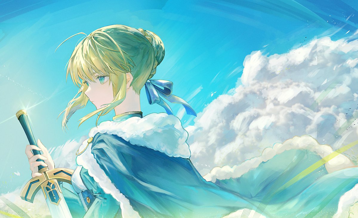 1girl ahoge artoria_pendragon_(fate) blonde_hair blue_cape blue_dress blue_ribbon blue_sky braid braided_bun bun_with_braided_base cape cloud day dress excalibur_(fate/stay_night) fate/stay_night fate_(series) floating_hair from_side fur-trimmed_cape fur_trim green_eyes hair_bun hair_ribbon holding holding_sword holding_weapon nigiri ribbon saber_(fate) sidelocks single_hair_bun sky solo sparkle sword upper_body weapon