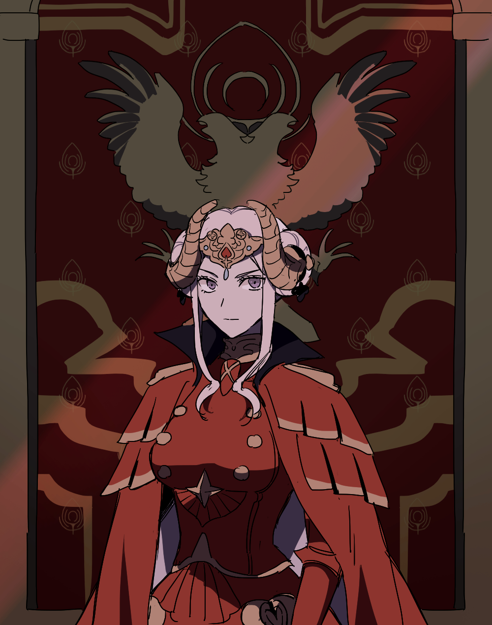 1girl breasts buttons cape commentary_request crown double_bun dress edelgard_von_hresvelg edelgard_von_hresvelg_(timeskip) fire_emblem fire_emblem:_three_houses frown hair_bun hair_up highres horns korean_commentary large_breasts looking_at_viewer nintendo purple_eyes red_cape red_dress serious sidelocks solo tapestry udeudede upper_body white_hair