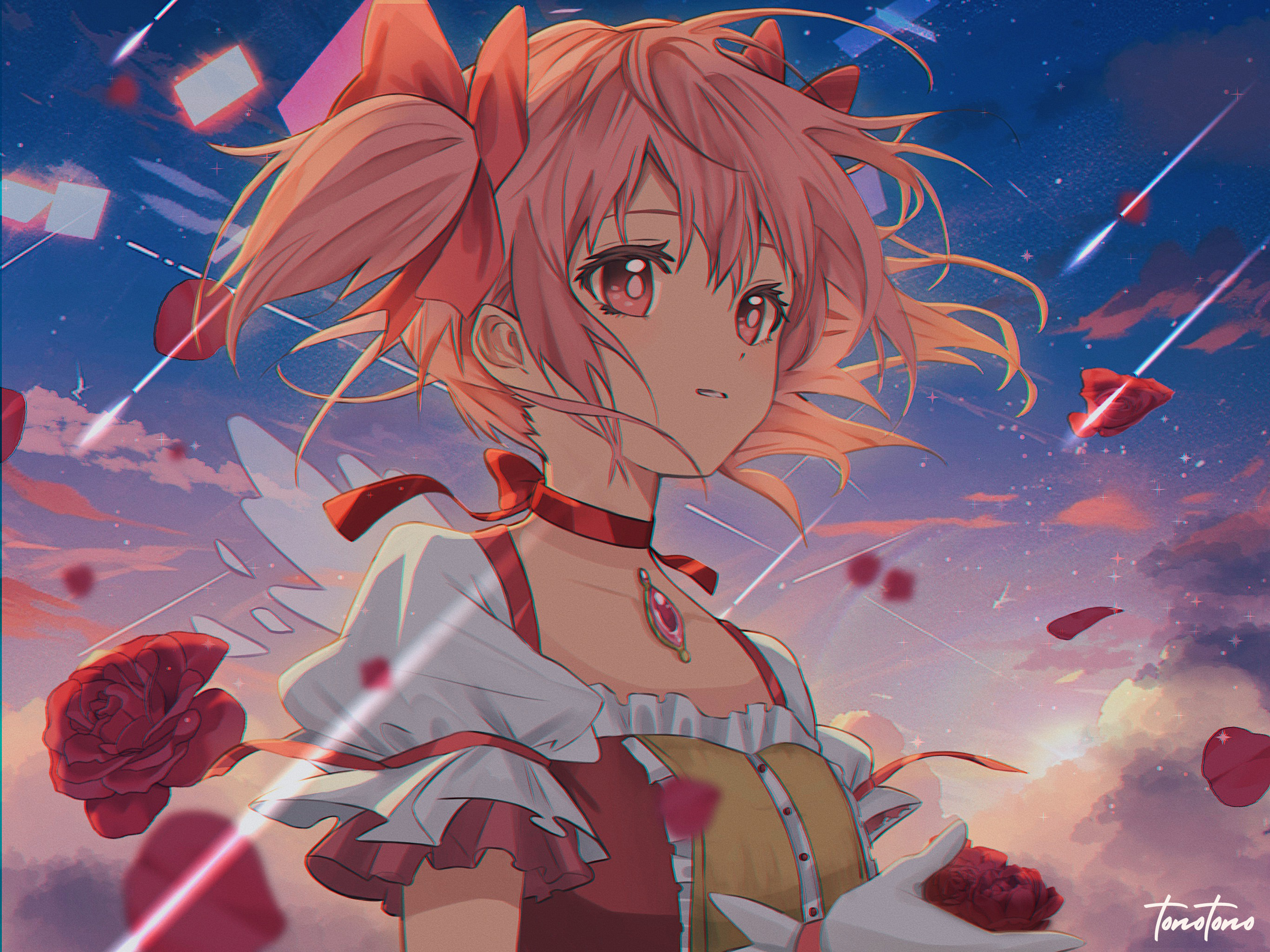 1girl blue_sky bright_pupils center_frills choker cloud cloudy_sky collarbone dot_nose flat_chest floating_hair flower frilled_sleeves frills gloves gradient_sky hair_ribbon highres holding holding_flower kaname_madoka kaname_madoka_(magical_girl) light_particles light_smile looking_afar mahou_shoujo_madoka_magica mahou_shoujo_madoka_magica_(anime) meteor_shower outdoors parted_lips petals pink_eyes pink_hair pink_ribbon pink_sky puffy_short_sleeves puffy_sleeves purple_sky red_choker red_flower red_ribbon red_rose ribbon ribbon_choker rose rose_petals ruibluesky short_sleeves short_twintails sky solo soul_gem sparkle sun sunlight sunset tareme transparent_wings twintails upper_body white_gloves white_pupils wings