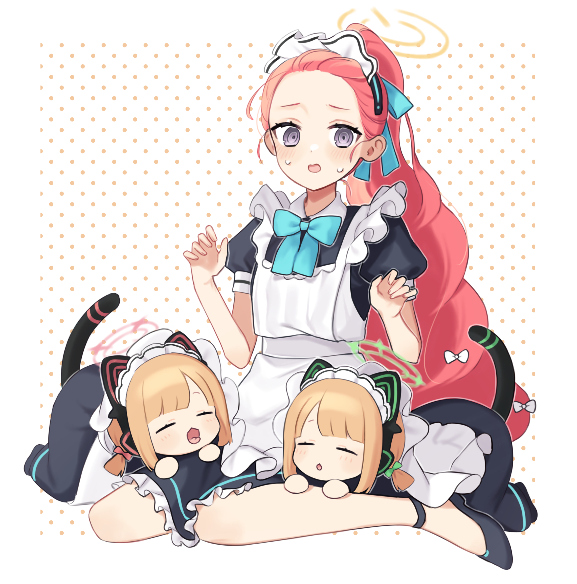 3girls all_fours animal_ear_headphones animal_ears apron black_dress blonde_hair blue_archive blue_bow blush bow bowtie cat_ear_headphones cat_ears chibi dress fake_animal_ears forehead frilled_apron frills green_halo halo headphones highres lying maid maid_apron maid_headdress midori_(blue_archive) midori_(maid)_(blue_archive) momoi_(blue_archive) momoi_(maid)_(blue_archive) multiple_girls official_alternate_costume orange_halo ponytail poyadi puffy_short_sleeves puffy_sleeves red_hair ribbon short_hair short_sleeves siblings sisters tail twins twintails white_apron yellow_halo yuzu_(blue_archive) yuzu_(maid)_(blue_archive)