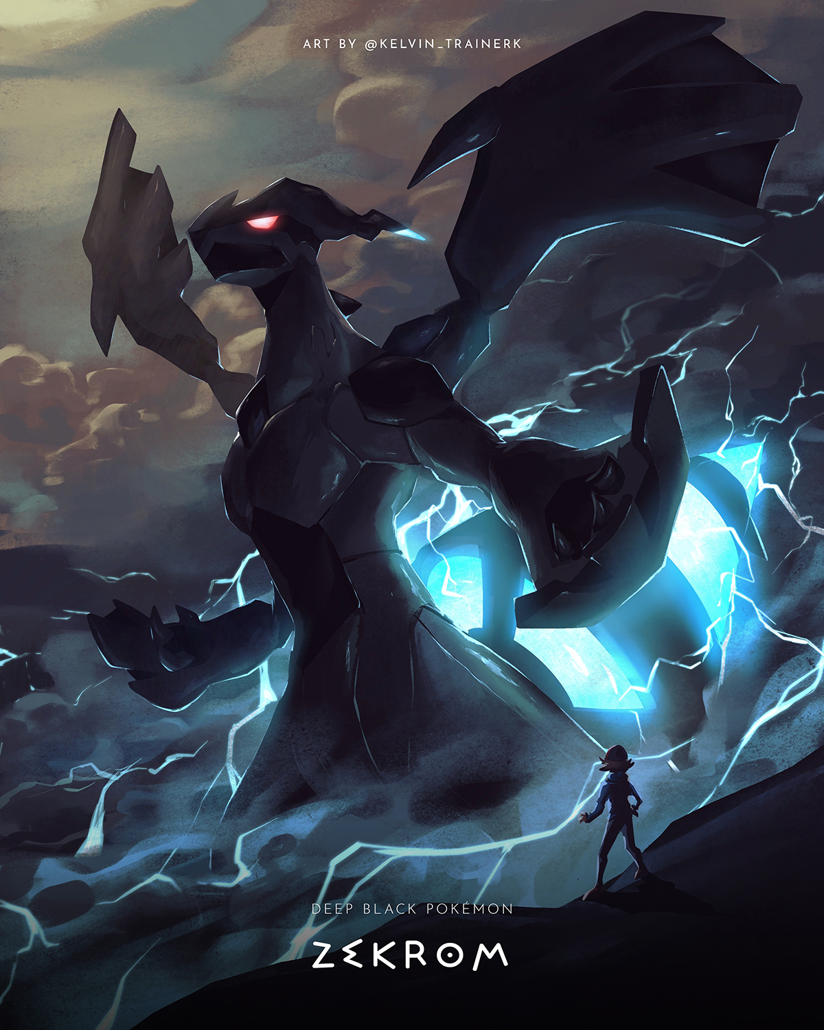1boy character_name claws commentary copyright_name electricity gen_5_pokemon glowing glowing_eyes hat highres hilbert_(pokemon) jacket kelvin-trainerk legendary_pokemon male_focus nintendo outdoors pants pokemon pokemon_(creature) pokemon_black_and_white short_hair standing twitter_username watermark zekrom zekrom_(overdrive)