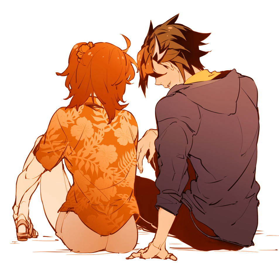 1boy 1girl ahoge brown_hair fate/grand_order fate_(series) from_behind fujimaru_ritsuka_(female) fujimaru_ritsuka_(female)_(tropical_summer) hair_between_eyes hair_ornament hair_scrunchie hawaiian_shirt hood hooded_jacket jacket kotobuki_toro legs_up male_focus mandricardo_(fate) mandricardo_(summer_sportswear)_(fate) medium_hair multicolored_hair official_alternate_costume one_side_up orange_hair orange_scrunchie orange_shirt scrunchie shirt short_hair short_shorts shorts simple_background sitting smile streaked_hair white_background white_hair