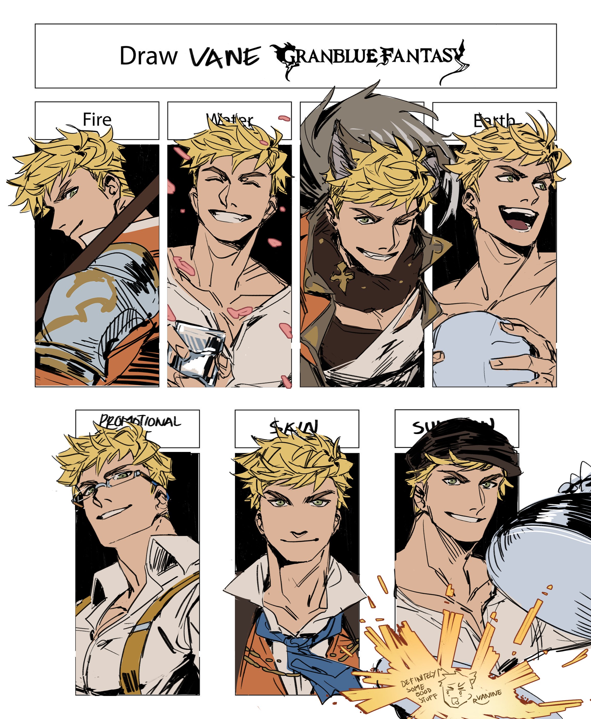1boy absurdres animal_ears ball beret black_tank_top blonde_hair character_name closed_eyes closed_mouth collared_shirt copyright_name falling_petals fur_collar glasses granblue_fantasy green_eyes hat highres holding holding_ball jacket male_focus official_alternate_costume open_clothes open_jacket open_mouth orange_jacket orange_vest petals riverion shirt short_hair smile suspenders tail tank_top teeth topless_male torn_clothes torn_shirt vane_(granblue_fantasy) vane_(halloween)_(granblue_fantasy) vane_(summer)_(granblue_fantasy) vane_(the_dragon_knights)_(granblue_fantasy) vest volleyball_(object) white_shirt wolf_boy wolf_ears wolf_tail