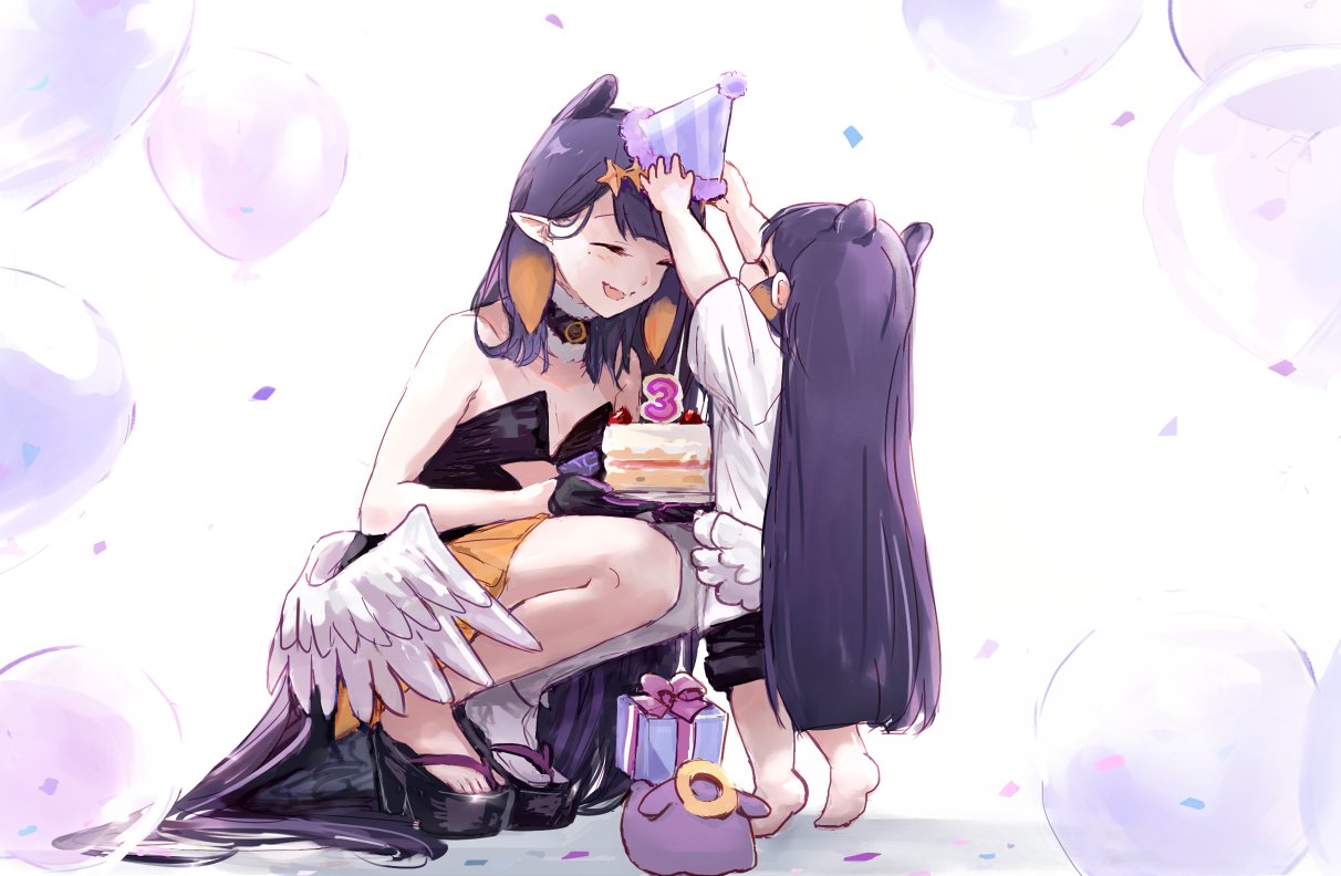 2girls animal_ears balloon barefoot black_gloves box child closed_eyes confetti dress gift gift_box gloves happy_birthday hat high_heels holding holding_gift hololive hololive_english low_wings multiple_girls ninomae_ina'nis ninomae_ina'nis_(1st_costume) open_mouth party_hat pointy_ears purple_hair shirt shorts smile squatting standing takodachi_(ninomae_ina'nis) tentacle_hair virtual_youtuber wings yuuyu_(777)