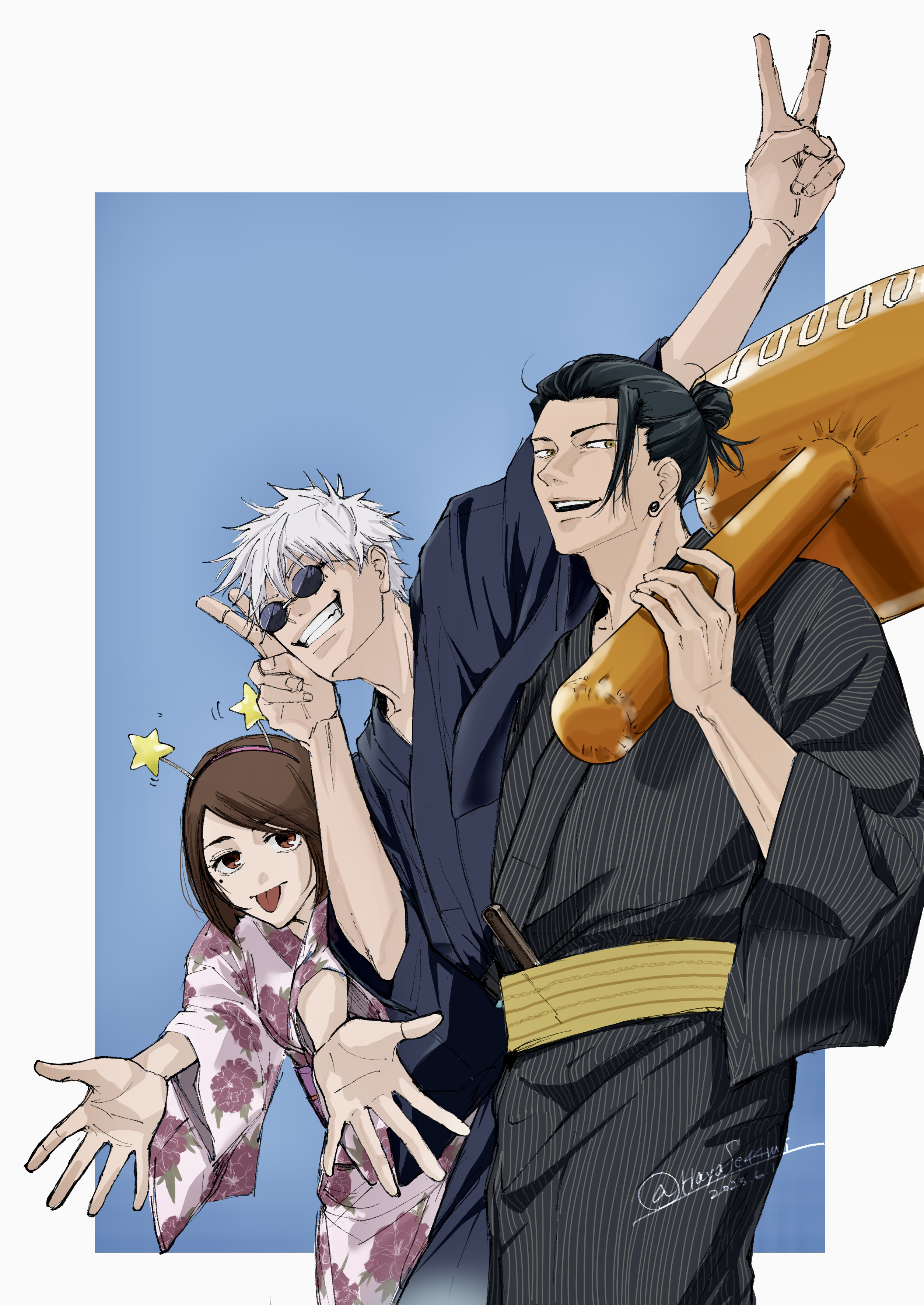 1girl 2boys :p absurdres arm_up black_hair black_kimono blue_background blue_kimono brown_eyes brown_hair cowboy_shot double_v ear_piercing floral_print geto_suguru gojo_satoru grin hair_bun hammer hayapi_(hayase44) highres holding holding_hammer ieiri_shoko inflatable_toy japanese_clothes jujutsu_kaisen kimono mole mole_under_eye multiple_boys open_hands open_mouth piercing pink_kimono round_eyewear short_hair smile standing sunglasses teeth tongue tongue_out v white_hair wide_sleeves yukata