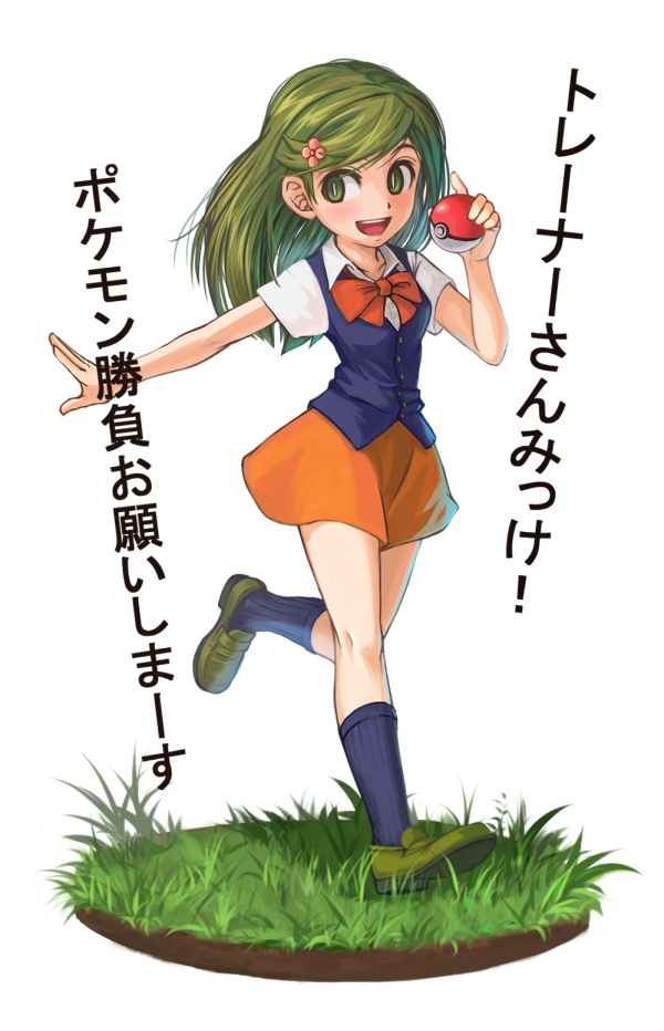 1girl bow breasts brown_hair green_shoes hapchi lass_(pokemon) lass_(pokemon_dppt) medium_breasts nintendo poke_ball pokemon pokemon_diamond/pearl/platinum red_bow red_skirt ribbed_socks shoes skirt socks