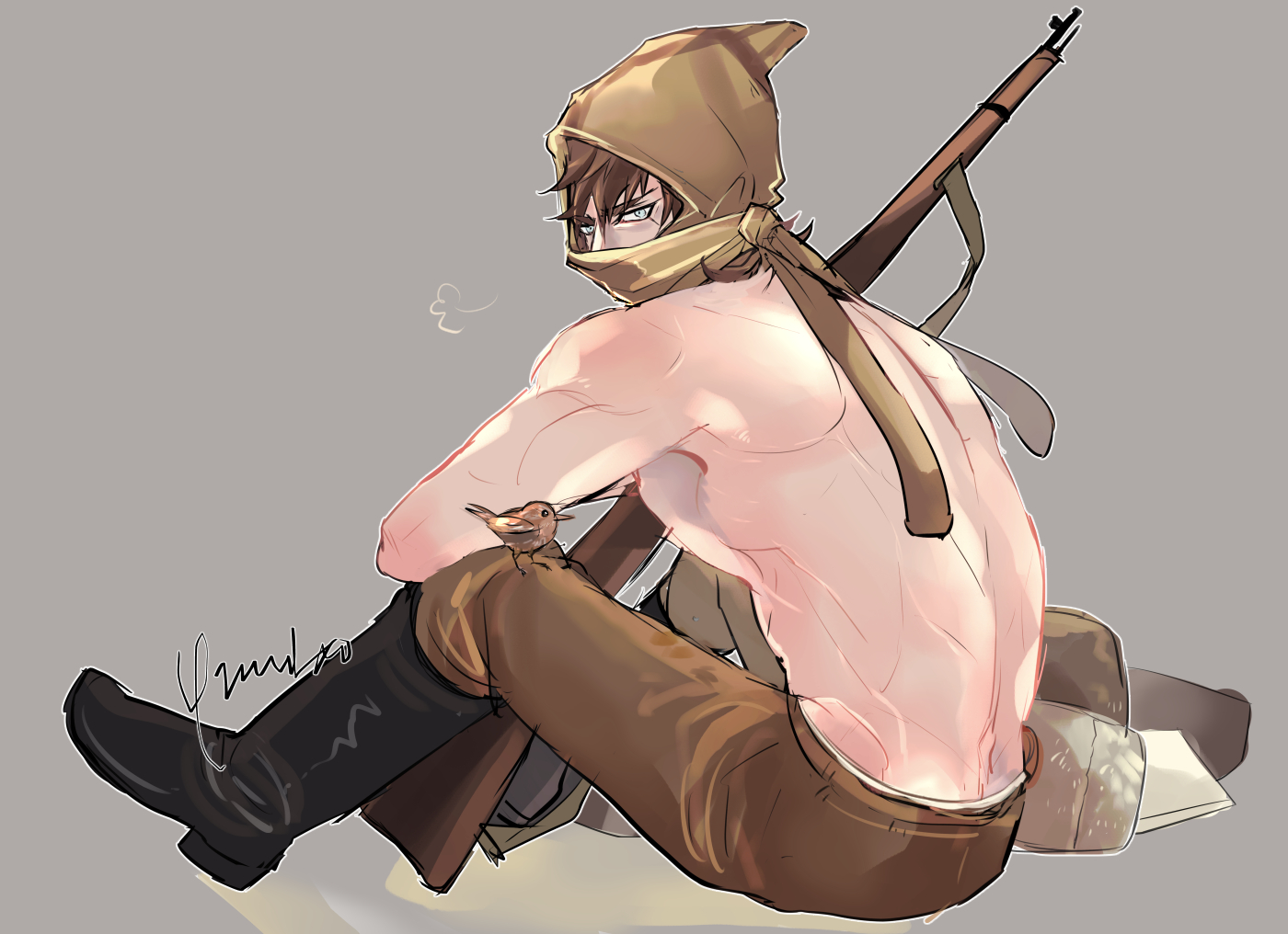 1boy bird bird_on_leg blue_eyes bolt_action boots brown_hair full_body fur_hat golden_kamuy gun hat looking_at_viewer male_focus mask mosin-nagant mouth_mask rifle short_hair sitting solo toned toned_male topless_male vasily_(golden_kamuy) weapon yumi_(soak1111)
