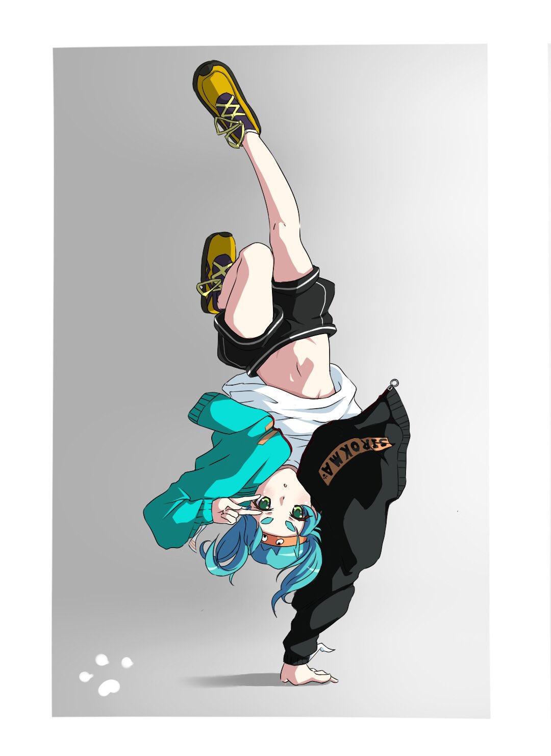 1girl aqua_hair black_shorts border full_body green_eyes grey_background handstand highres jacket looking_at_viewer medium_hair monogatari_(series) navel one_arm_handstand ononoki_yotsugi open_clothes open_jacket shirt shoes short_eyebrows shorts sirokuma sneakers solo thick_eyebrows twintails upside-down v v_over_eye white_border white_shirt