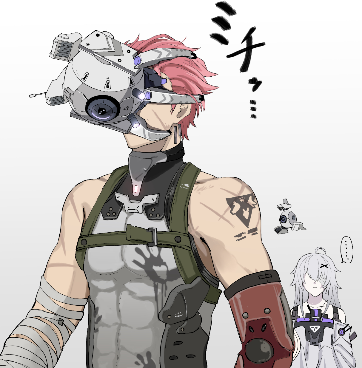 ... 1boy 1girl ahoge bandage_over_one_eye bandaged_arm bandages bare_shoulders dress earrings grey_dress grey_hair highres jewelry long_hair long_sleeves mechanical_arms no._21:_xxi_(pgr) no._21_(pgr) noctis:_indomitus_(pgr) noctis_(pgr) non-humanoid_robot nyoro1980 punishing:_gray_raven red_hair robot scar scar_on_arm scar_on_face scar_on_shoulder scar_on_shoulders short_hair shoulder_tattoo single_mechanical_arm tattoo