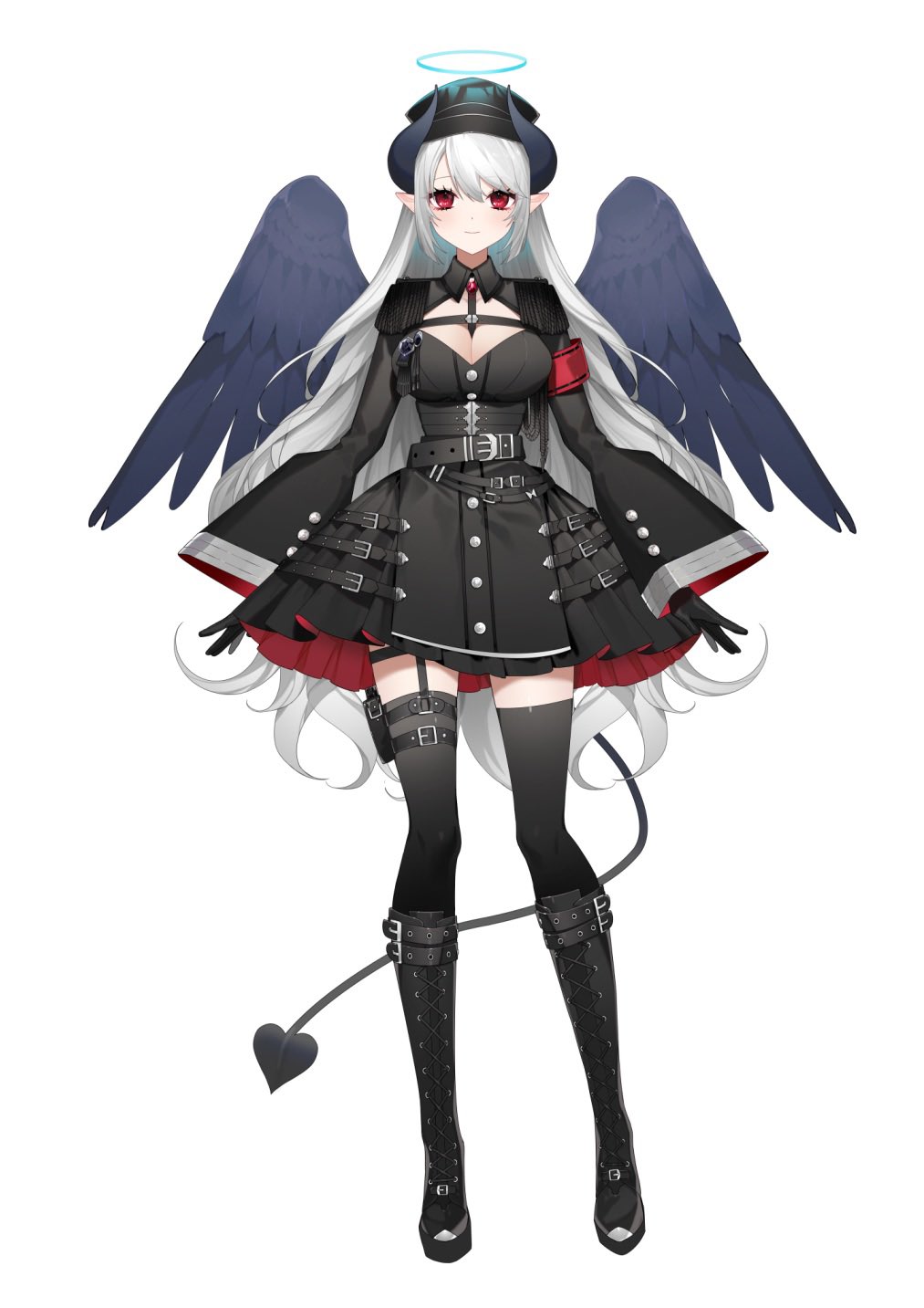 1girl akuma_meryl between_breasts black_boots black_thighhighs boots breasts cleavage closed_mouth comori demon_tail dress eclipse_live_project feathered_wings full_body garter_straps halo highres horns large_breasts long_hair long_sleeves looking_at_viewer medium_breasts red_eyes sidelocks smile solo standing tail thighhighs virtual_youtuber white_background white_hair wings