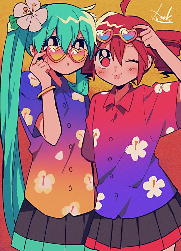 2girls :p adjusting_eyewear aqua_eyes aqua_hair black_skirt blush bracelet drill_hair eyewear_on_head floral_print flower hair_flower hair_ornament hatsune_miku hawaiian_shirt hibiscus hibiscus_print jewelry kasane_teto long_hair looking_at_viewer multiple_girls one_eye_closed open_mouth pleated_skirt print_shirt red_eyes red_hair red_trim shirt short_hair short_sleeves skirt smile sunglasses t-shirt tongue tongue_out twin_drills twintails utau very_long_hair vocaloid white_flower yuusuke-kun