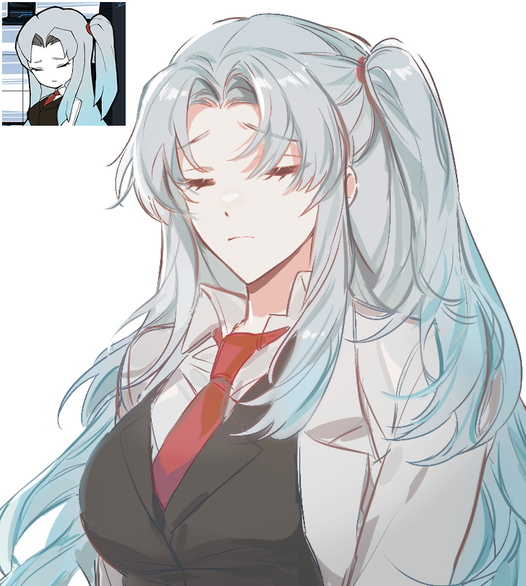 angela_(project_moon) black_jacket blue_hair closed_eyes closed_mouth coat collared_shirt frown jacket lab_coat lobotomy_corporation long_hair long_sleeves munjiduck necktie one_side_up parted_bangs project_moon red_necktie shirt side_ponytail simple_background upper_body very_long_hair white_background white_coat white_shirt wing_collar