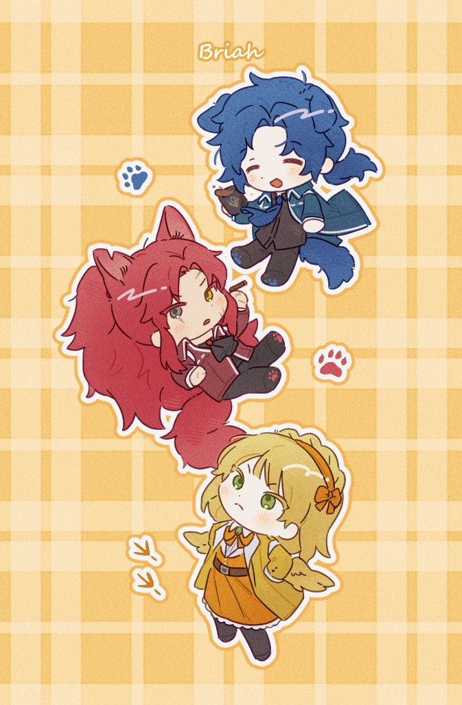 1boy 2girls animal_ears black_pantyhose blonde_hair blue_coat blue_hair bow bowtie chesed_(project_moon) chibi coat dog_ears dog_tail dress gebura_(project_moon) green_eyes grey_eyes heterochromia library_of_ruina multiple_girls munjiduck orange_bow orange_bowtie orange_dress pantyhose paw_print project_moon red_coat red_hair tail tiphereth_a_(project_moon) wings wolf_ears wolf_tail yellow_coat yellow_eyes yellow_wings